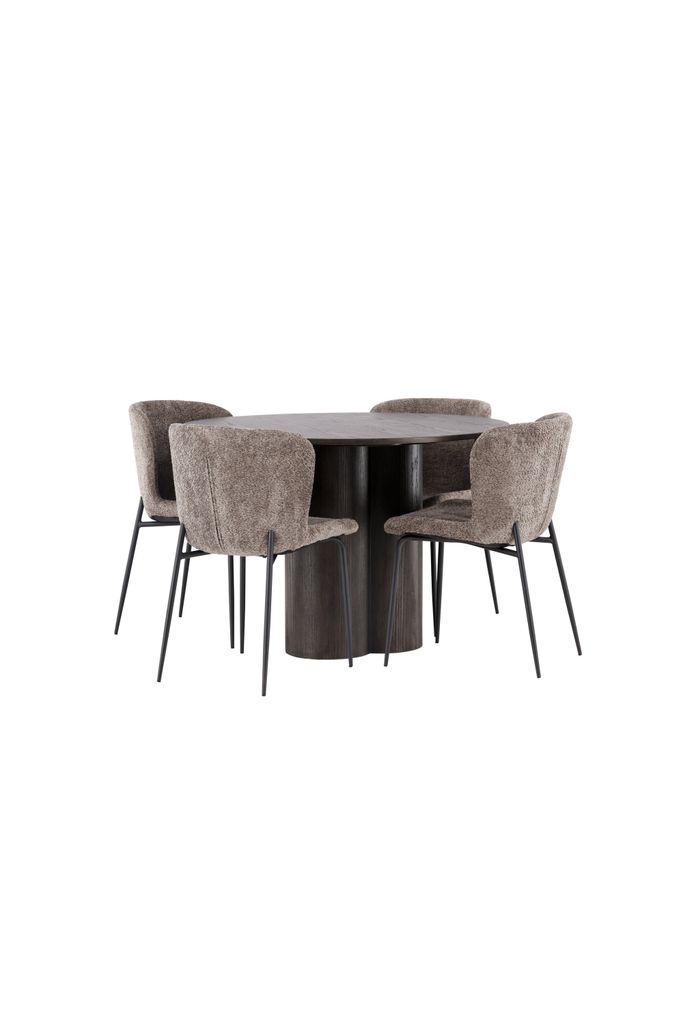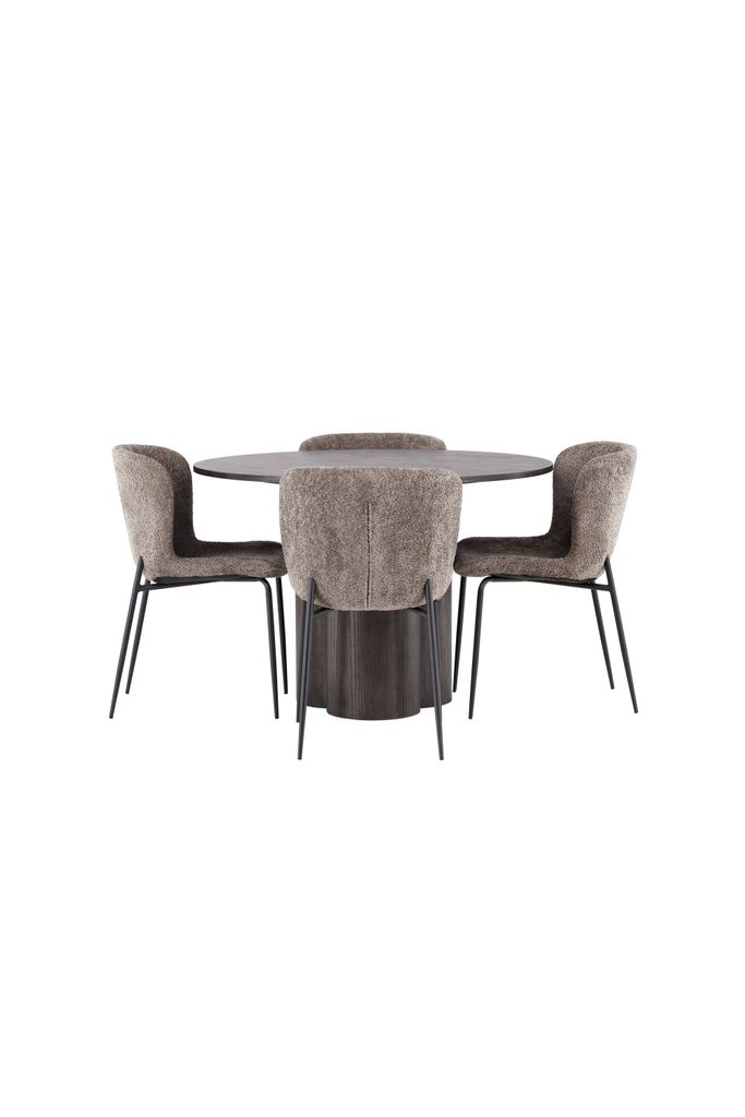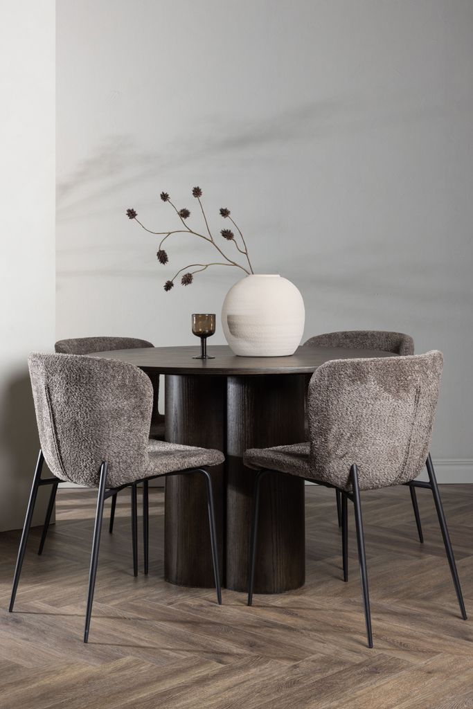 Kompletterat med de trendiga matstolarna från Modesto-serien, är detta set en modeikon för matsalen. Stolarna är helklädda i ett grått lurvigt tyg med stilrena, smala ben i svart metall. Den lätt rundade ryggen tillsammans med den stoppade sittdynan ger utomordentlig komfort vilket förlänger de trivsamma måltiderna kring detta eleganta bord. Bordets diameter är 110 cm vilket erbjuder en generös yta för både middag och samtal.