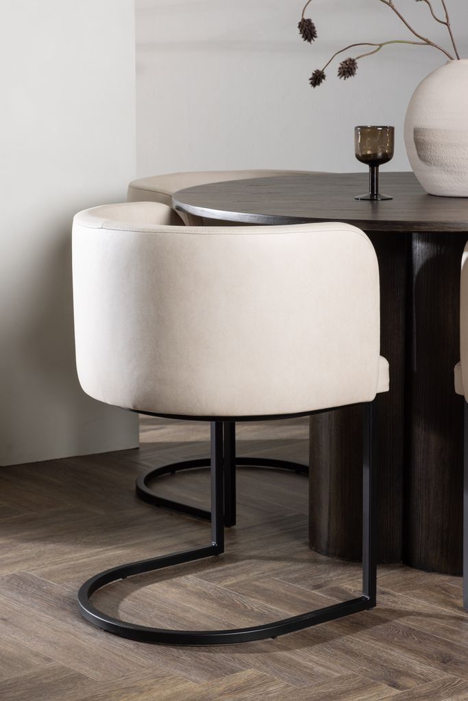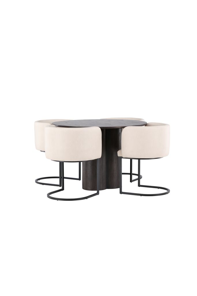 Tillsammans med bordet kommer fyra Simrishamn matstolar. Stolarna har en helklädd sits i mjukt beige TC-tyg och ett rundat ryggstöd som ger utmärkt komfort. Den dekorativa, minimalistiska benstommen i svart stål kompletterar bordets moderna design och ger en sofistikerad look till ditt matrum.