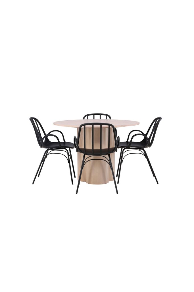 Kompletterad med de eleganta Dyrön-stolarna i svart plast, erbjuder denna matgrupp en modern touch till ditt hem. Stolarna är inte bara estetiskt tilltalande utan även ergonomiskt utformade för maximal komfort. De matta svarta stolarna har en följsam design som passar perfekt med bordets skandinaviska stil.