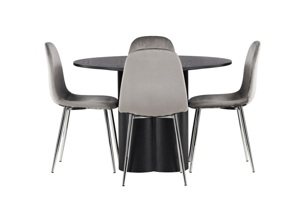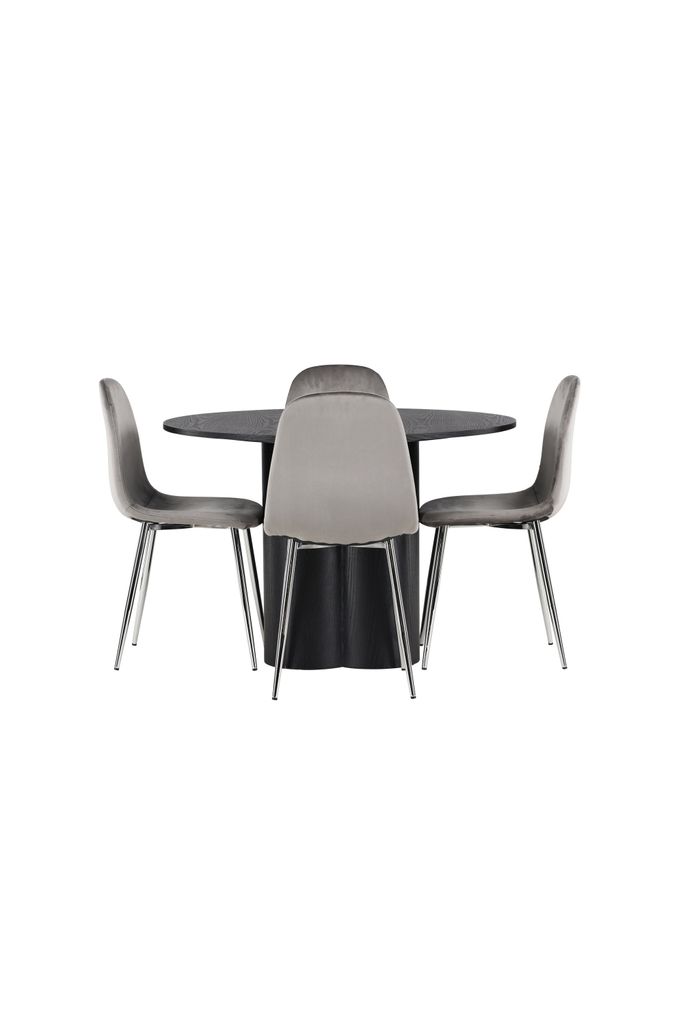 Venture Home Matgrupp Olivia med Stolarna Eva är en perfekt kombination av stil och funktion. Det runda matbordet i sotig svart kulör är tillverkat av MDF och har en elegant, tunn toppskiva som ger en luftig känsla i rummet. De tre cylinderformade benen tillför en modern touch och stabilitet.