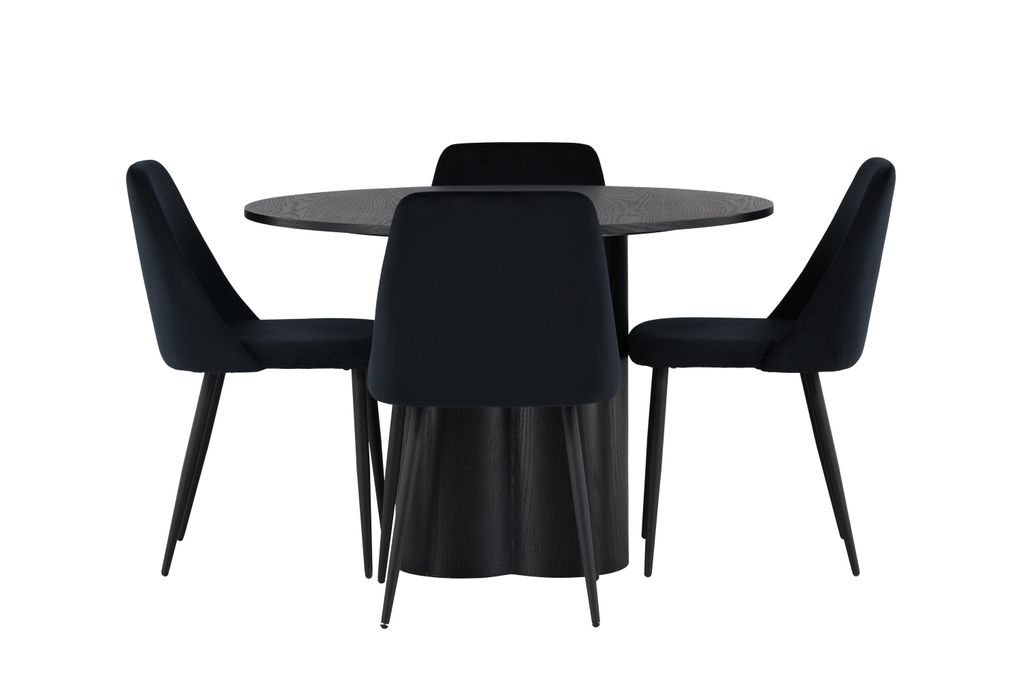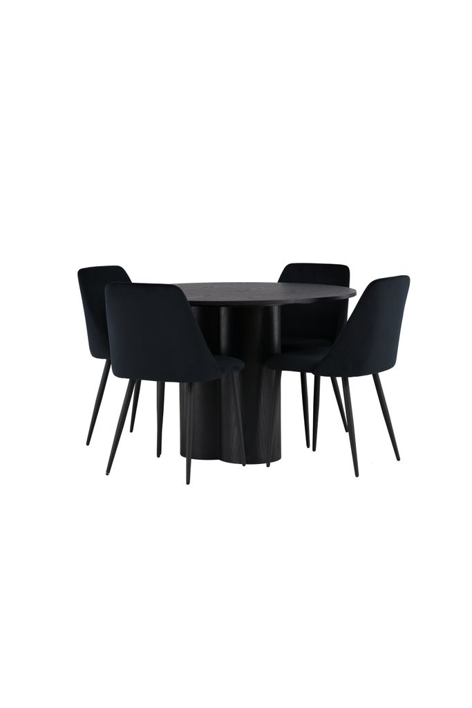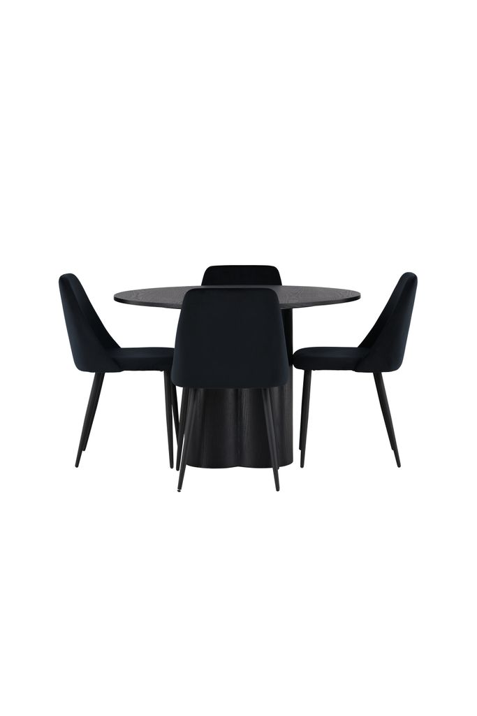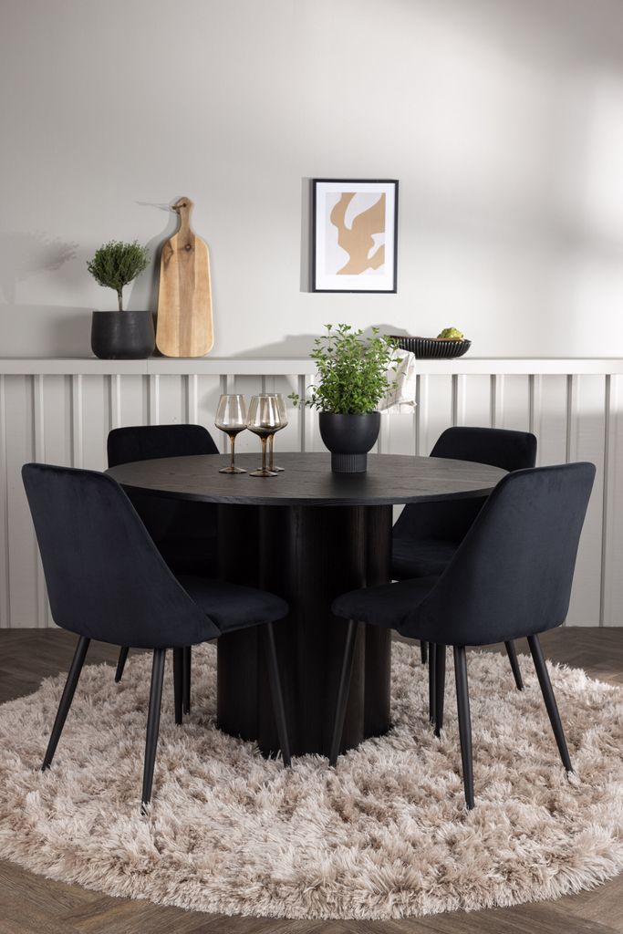 Upplev en sofistikerad touch med Venture Home Matgrupp Olivia tillsammans med stolarna Night. Denna eleganta matgrupp består av ett runt matbord och fyra matchande stolar, alla i genomgående svart färg som utstrålar modern lyx.