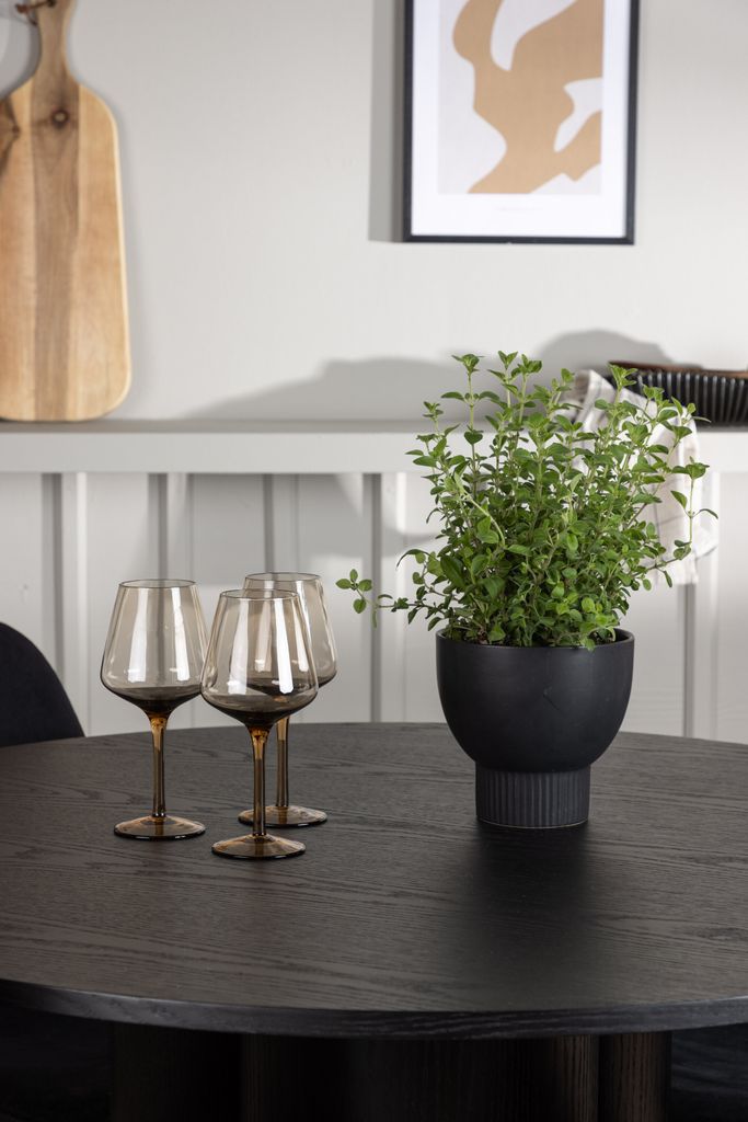Elegant matgrupp i svart med runda former och lyxiga material för stil och komfort.