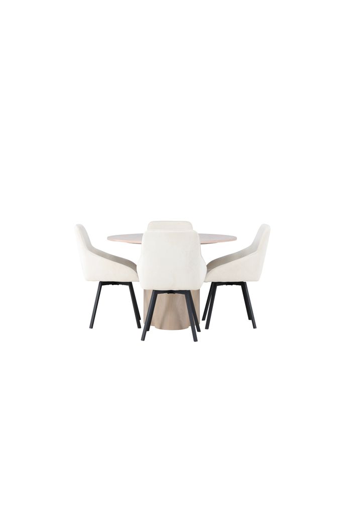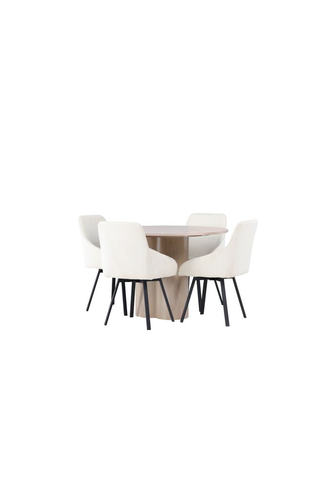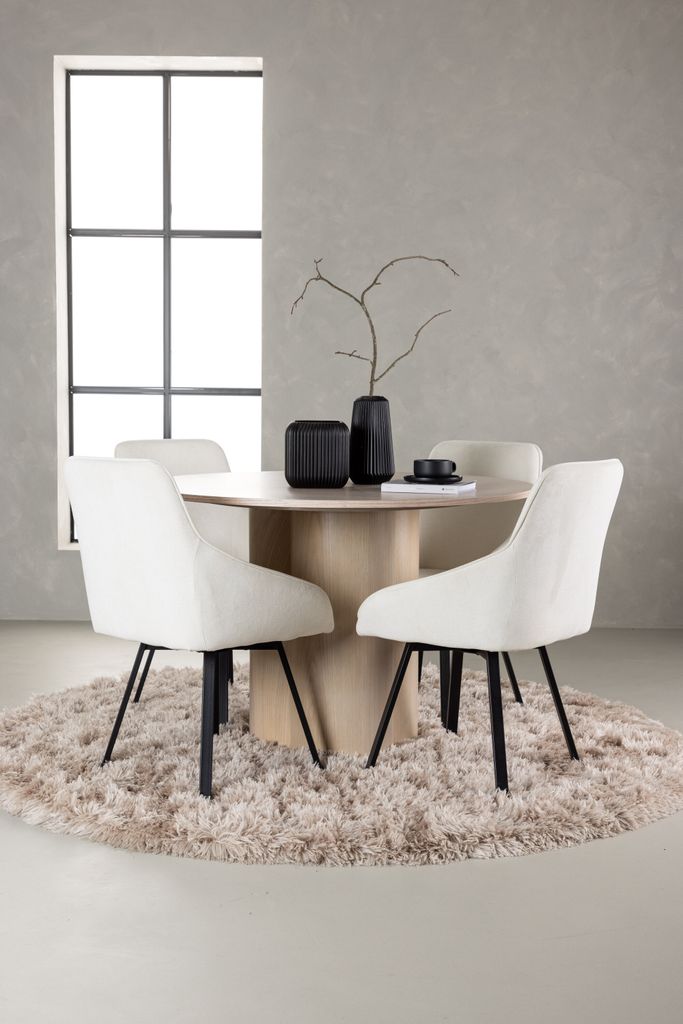 - Matbord Olivia: Ett stilrent runt matbord tillverkat av vitputsad MDF med en diameter på 110 cm. Bordets lätta utseende förstärks av de tre cylinderformade benen, vilket ger både stabilitet och elegans.