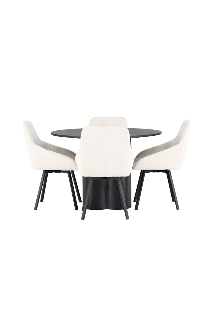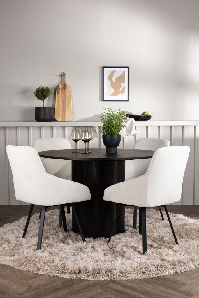 - Runt Matbord Olivia: Bordet har en elegant svart toppskiva i MDF med faner som framhäver de naturliga mönstren. De tre cylinderformade benen ger stabilitet och en modern känsla. Med en diameter på 110 cm blir det den perfekta samlingspunkten för varje måltid.