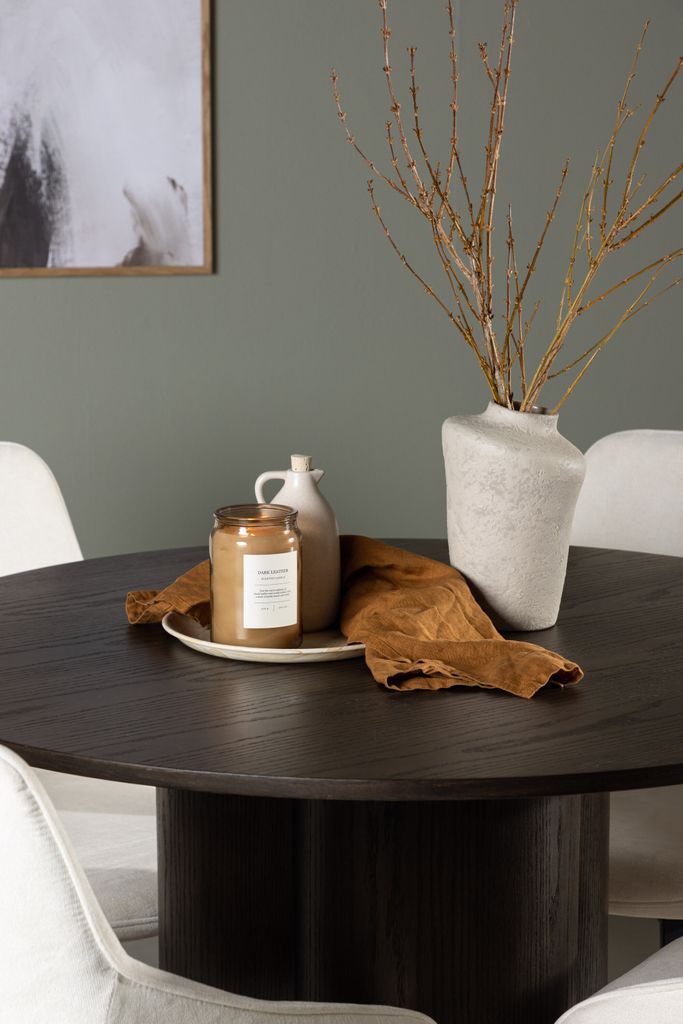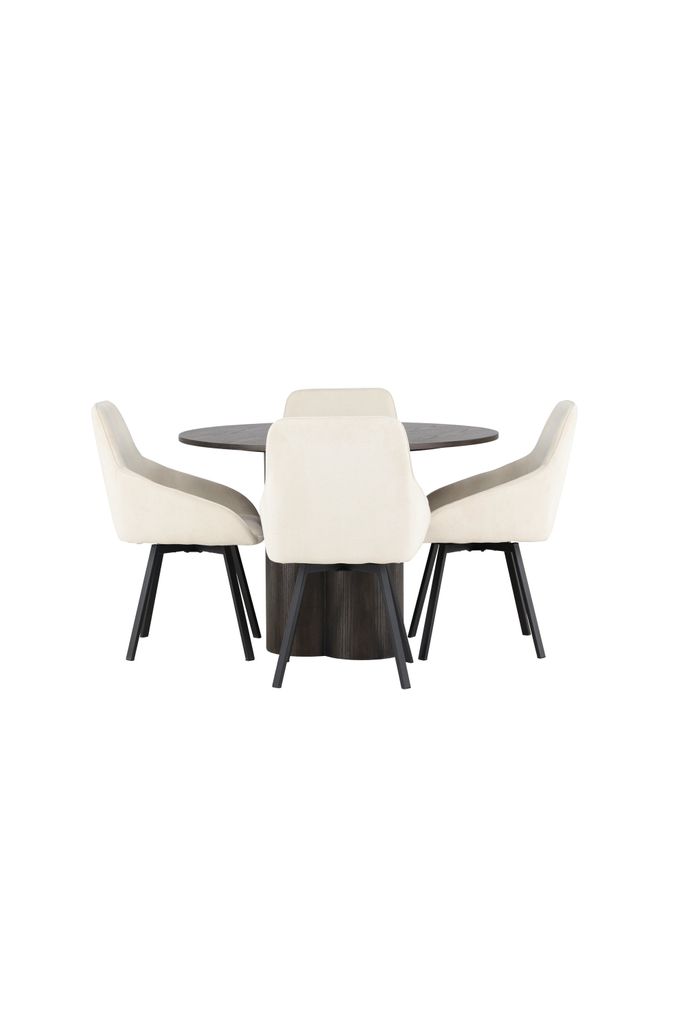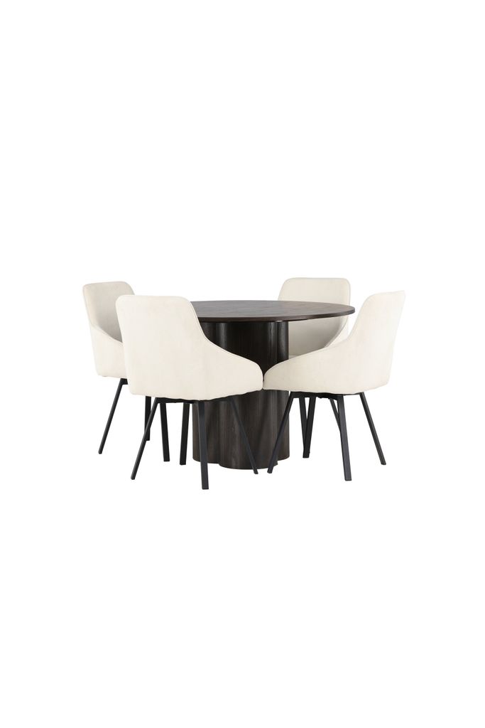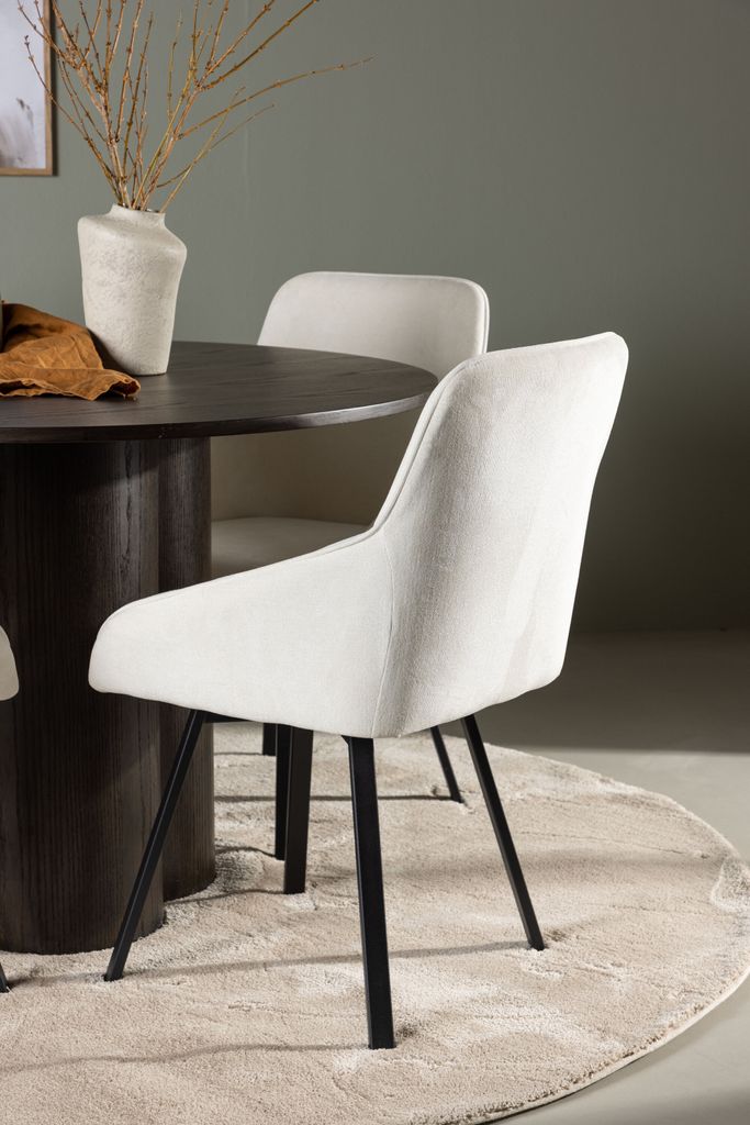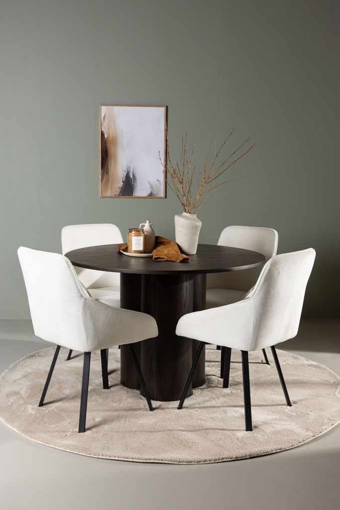 Bordet, med en diameter på 110 cm, kompletteras perfekt med stolar från vår populära serie Rosie. Stolarna har helklädda sitsar i ett varmt, beige tyg och integrerade armstöd som ger en inbjudande känsla. De svartmetalliska, lätt utsvängda benen ger en modern touch som kompletterar bordets eleganta design.