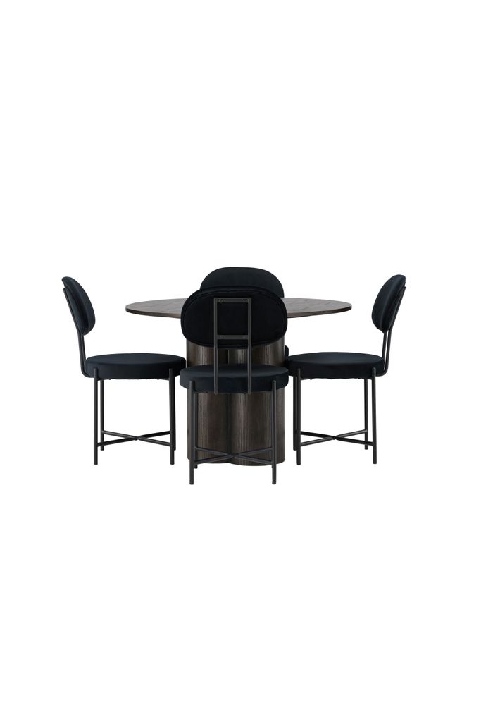 Matgrupp med skandinavisk design och komfort. Runt bord i mocca MDF och stolar i svart sammet för stil och lyx.