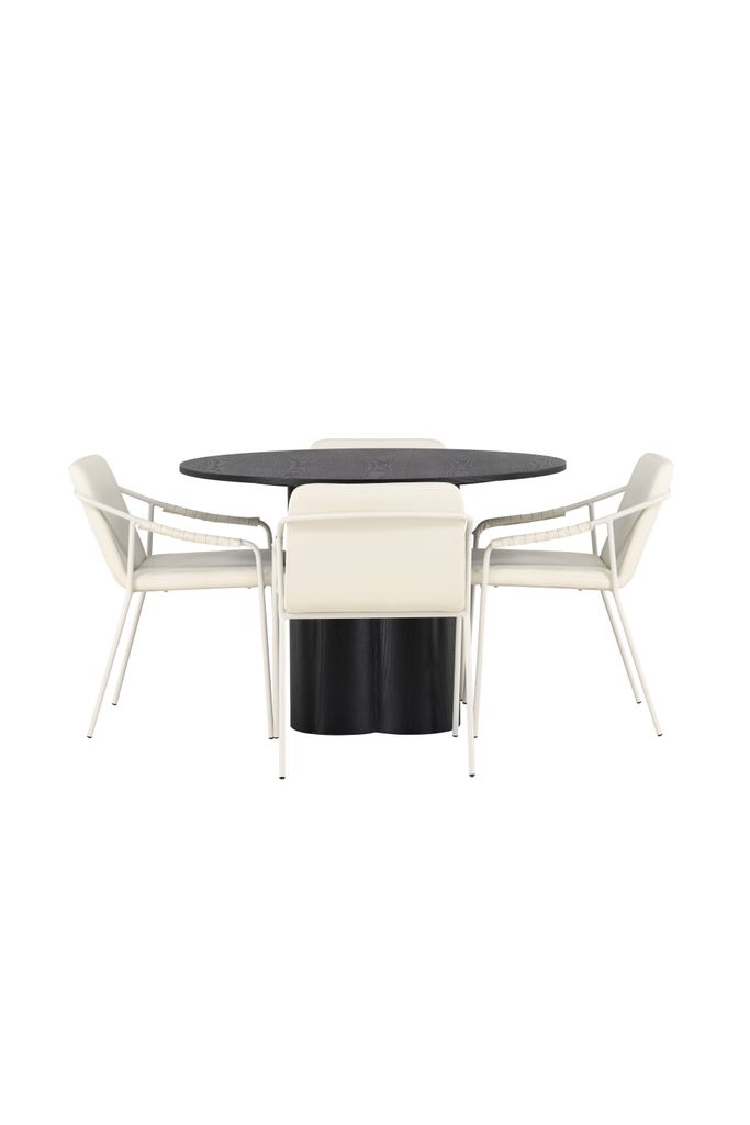 De medföljande Tvist-stolarna har en beige sits och rygg i polyuretanskinn och polyester, vilket skapar en inbjudande atmosfär. Stolarna vilar på minimalistiska järnben som bidrar till både stil och stabilitet. Denna kombination av bord och stolar erbjuder inte bara en bekväm sittplats, utan också en inredning som imponerar.