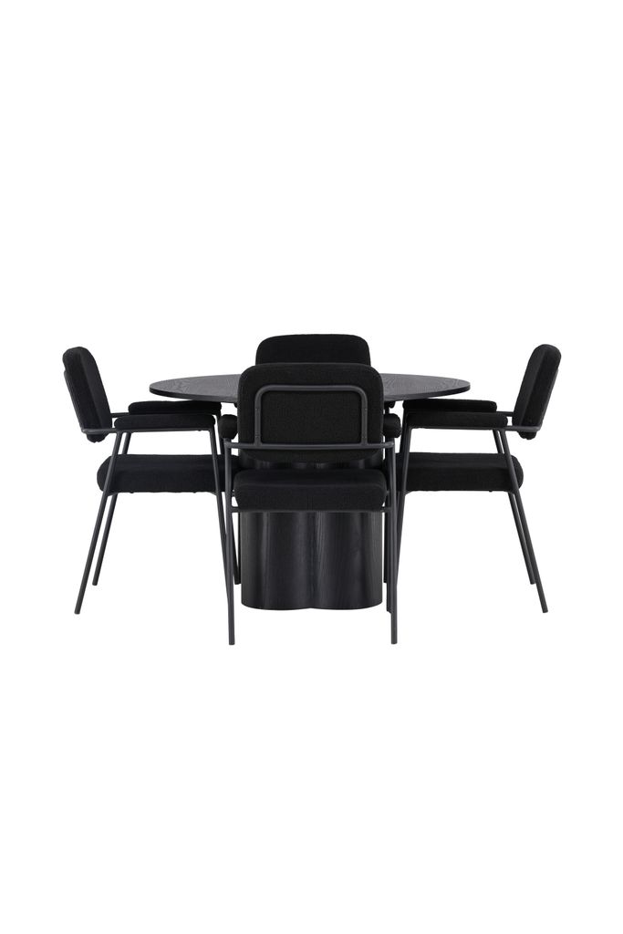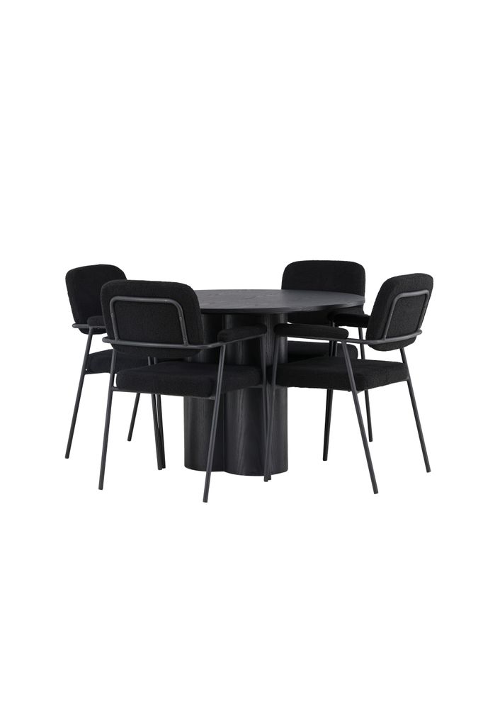 Elegant svart matgrupp med rund design, bekväma boucléstolar och stilrena detaljer för en lyxig matupplevelse.