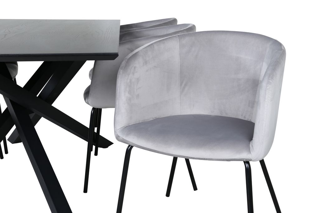 Elegant matgrupp med svart MDF-bord och grå sammetsstolar. Stilren och lyxig design för trivsamma måltider.
