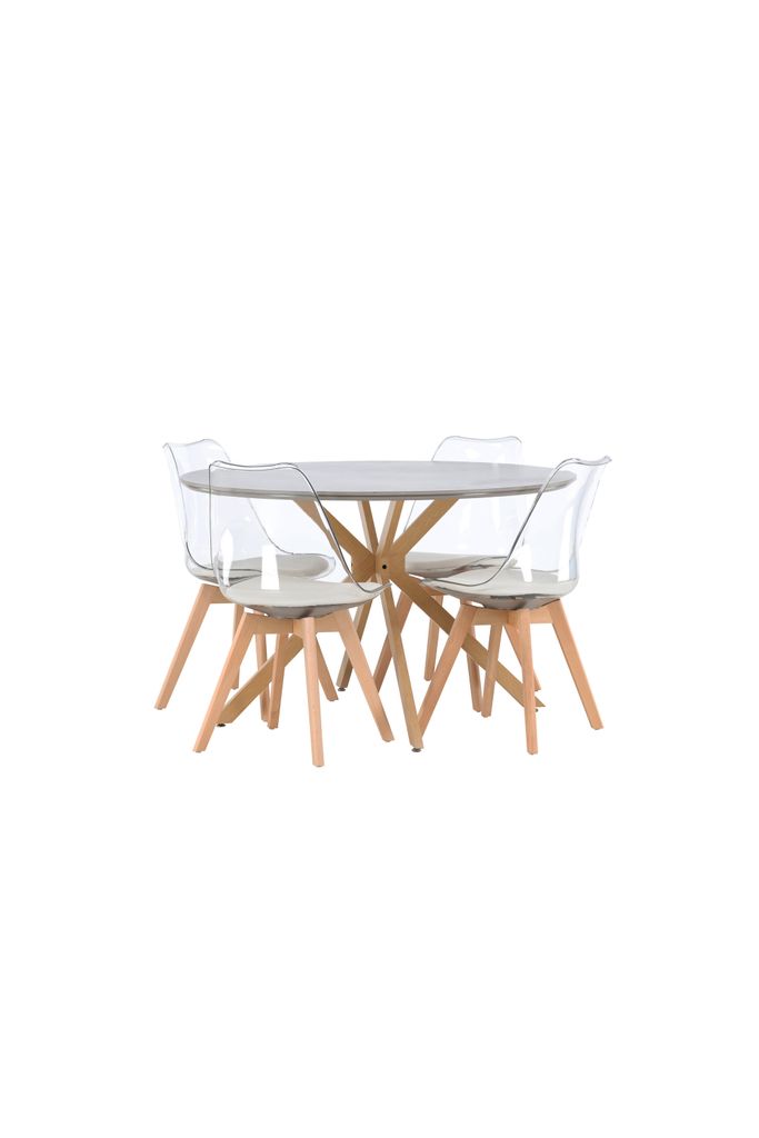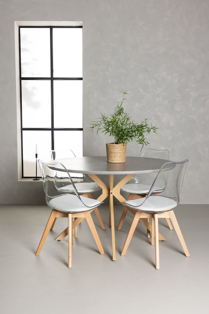 De tillhörande stolarna från serien Edvin har en unik design med en transparent sits i PET som ger en luftig och modern känsla. De lätt utsvängda benen i naturträ bidrar till en harmonisk och elegant helhet. För extra komfort är varje stol utrustad med en vit sittdyna.