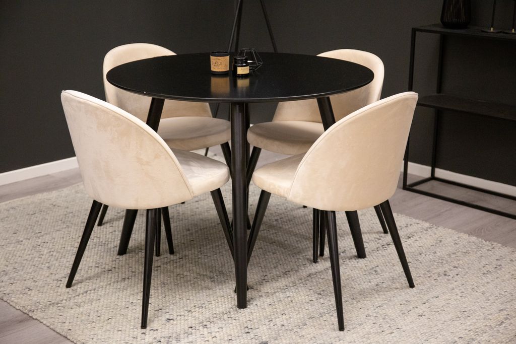 Skapa en stilfull och inbjudande atmosfär i ditt hem med Venture Home Matgrupp Plaza, kombinerad med de exklusiva stolarna i Velvet-serien. Denna matgrupp består av ett elegant, runt matbord med en slät, svart yta som kompletteras av fyra beige sammetsstolar.