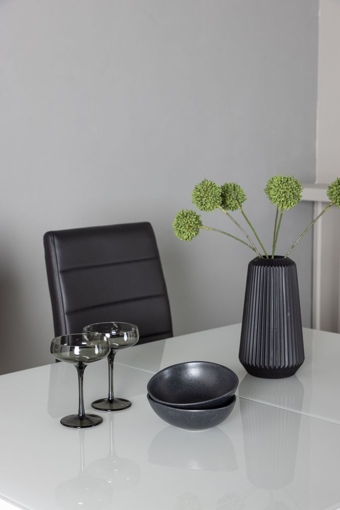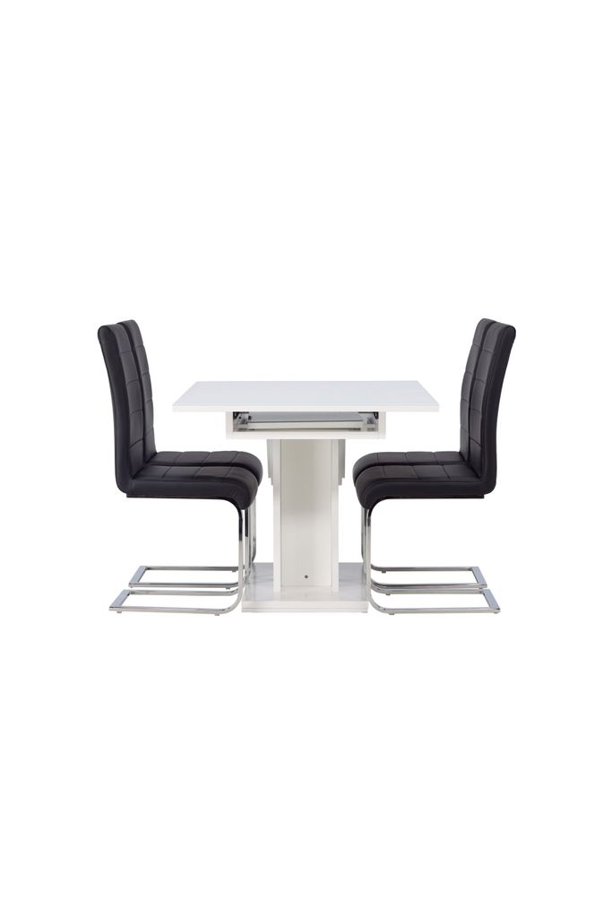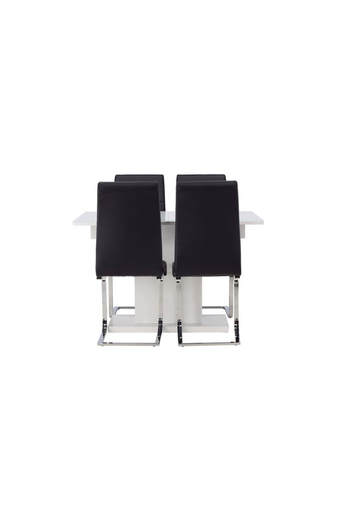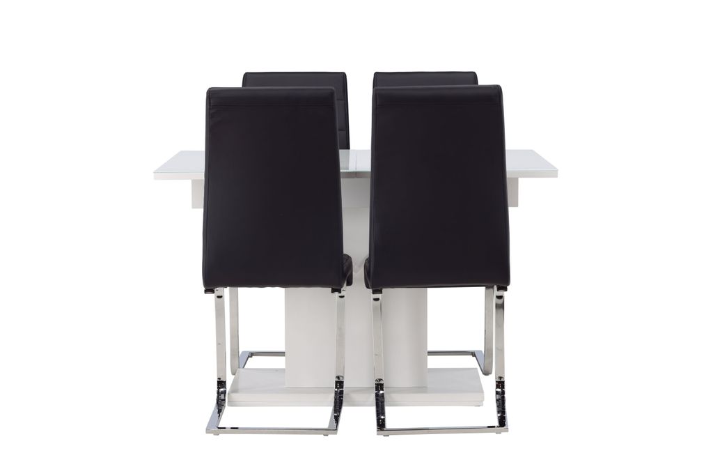Elegant matgrupp med förlängningsbart bord i vit MDF och matchande svarta stolar i PU-läder.
