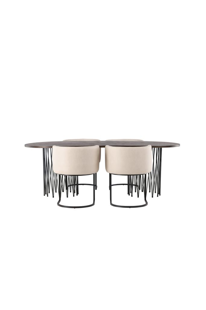 Inred ditt hem med stil och elegans med Venture Home Matgrupp Stone tillsammans med stolarna Simrishamn. Det ovala bordet har en brunfärgad bordsskiva i MDF med faner som ger en varm och inbjudande känsla. Bordets två cylinderformade stommar i svart metall ger en modern touch och stabilitet.