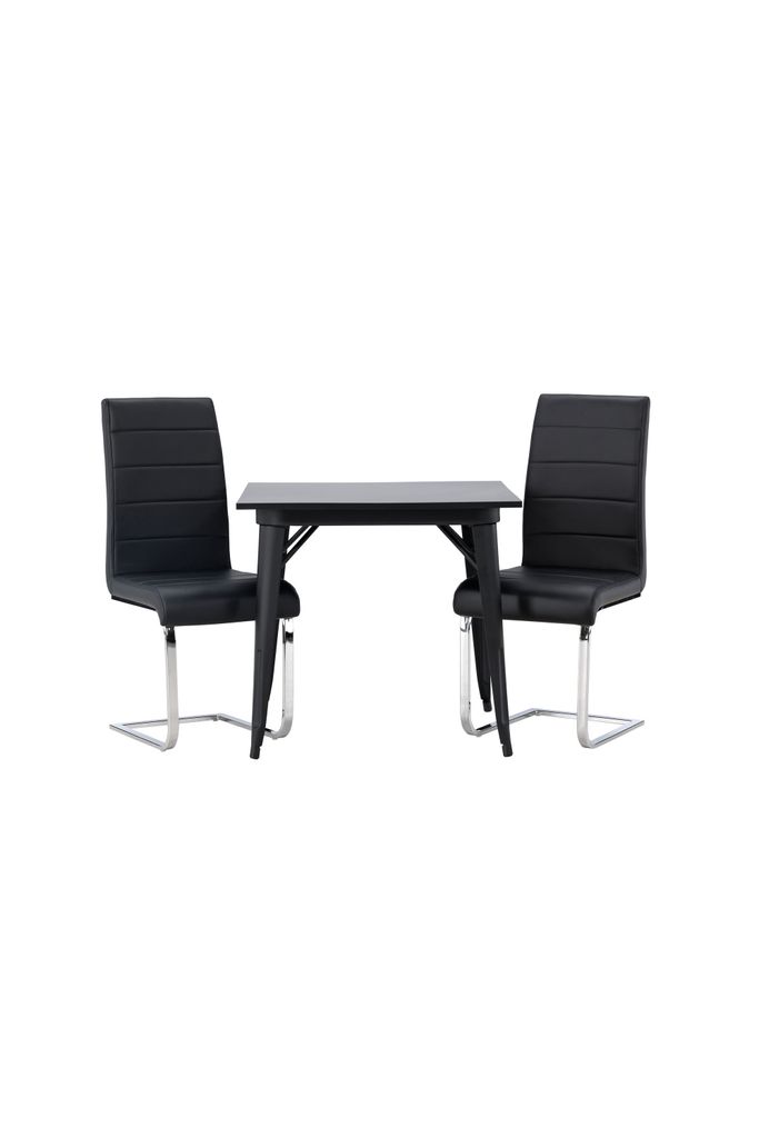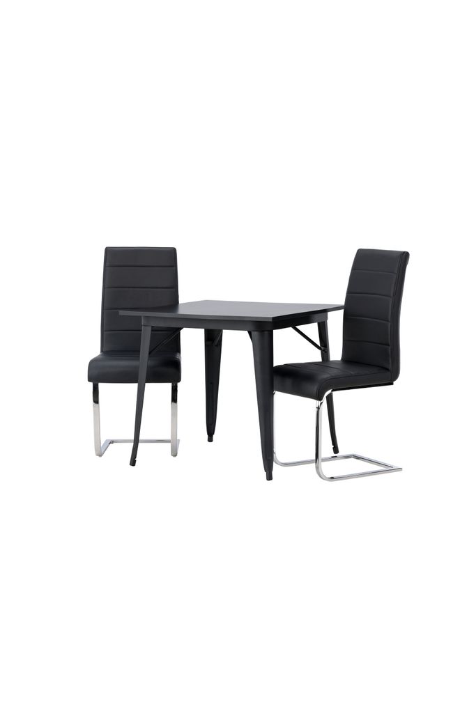 Förvandla ditt kök med Venture Home Matgrupp Tempe, som erbjuder en modern och stilren design inspirerad av den skandinaviska estetikens enkelhet och elegans. Det kvadratiska bordet, med måtten 80x80 cm, har en bordsskiva tillverkad av svart MDF och robusta bordsben i svart metall.