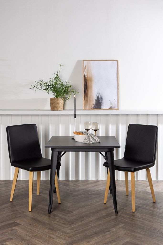 Venture Home Matgrupp Tempe med Stolarna Today är en elegant och funktionell lösning för ditt matrum. Bordet har en kvadratisk form med måtten 80x80 cm, vilket gör det idealiskt för mindre utrymmen. Med en bordsskiva i svart MDF och robusta bordsben i svart metall, kombinerar det stil och hållbarhet.