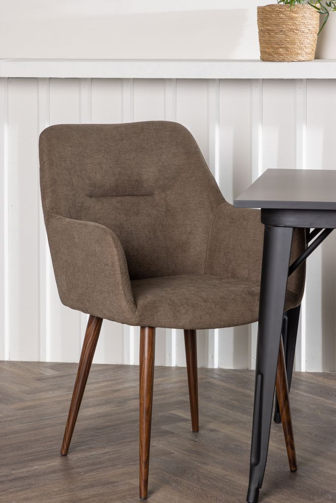 De två medföljande stolarna från serien Tomorrow har en elegant design med en helklädd sits i brunt polyestertyg som ger en varm och inbjudande känsla. Stolarna har integrerade armstöd för extra komfort och stolsbenen är lätt utsvängda med en modern valnötsbrun kulör, vilket kompletterar bordets minimalistiska estetik perfekt.