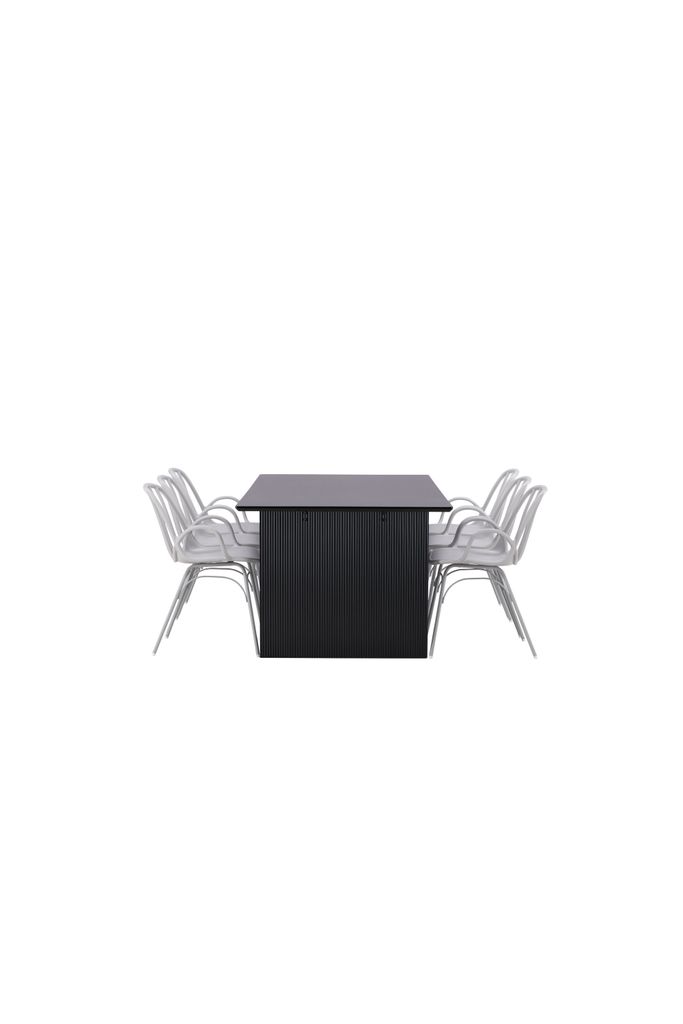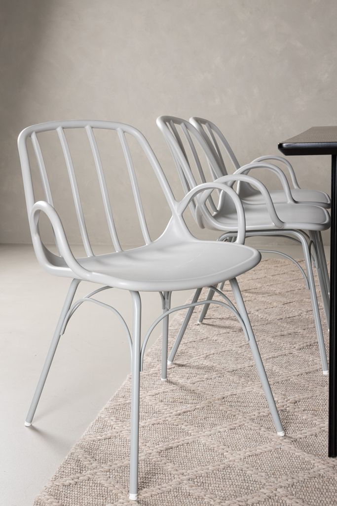 De medföljande Dyrön-stolarna erbjuder både stil och komfort. Tillverkade i greige plast med stålram, kombinerar dessa stolar en ribbad design med integrerade armstöd och en lätt rundad rygg för optimal sittkomfort. Den sofistikerade färgpaletten och det rena formspråket gör att denna matgrupp passar perfekt in i både moderna och traditionella inredningsmiljöer.