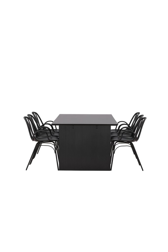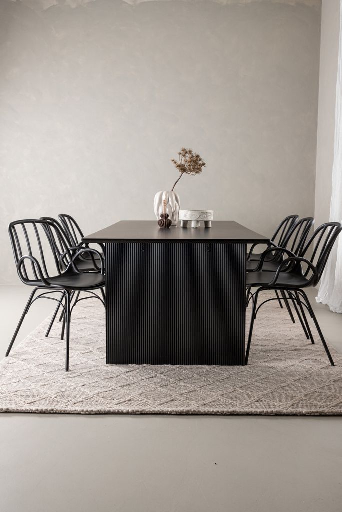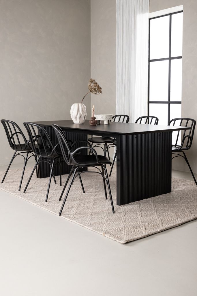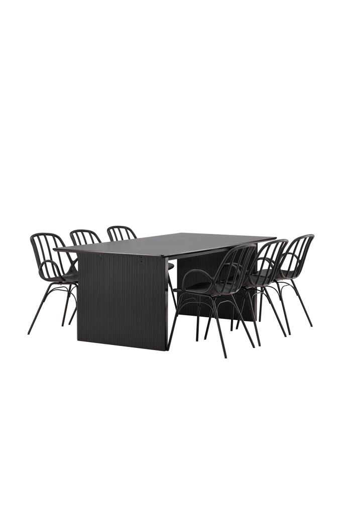 Matbordet har en rektangulär bordsskiva i slitstarkt svart MDF som vilar på två bastanta träskivor, vilket ger ett robust och modernt intryck. De medföljande Dyrön-stolarna är tillverkade i svart plast med en stabil stålkonstruktion. Stolarna har en ribbad rygg och integrerade armstöd som ger både komfort och stil.