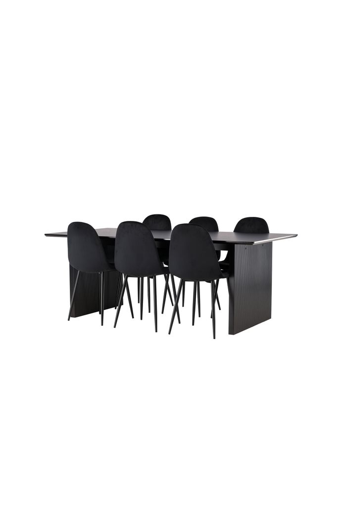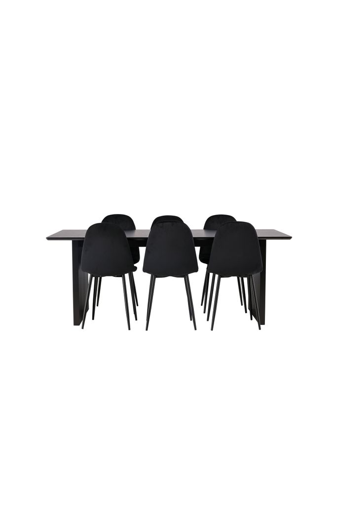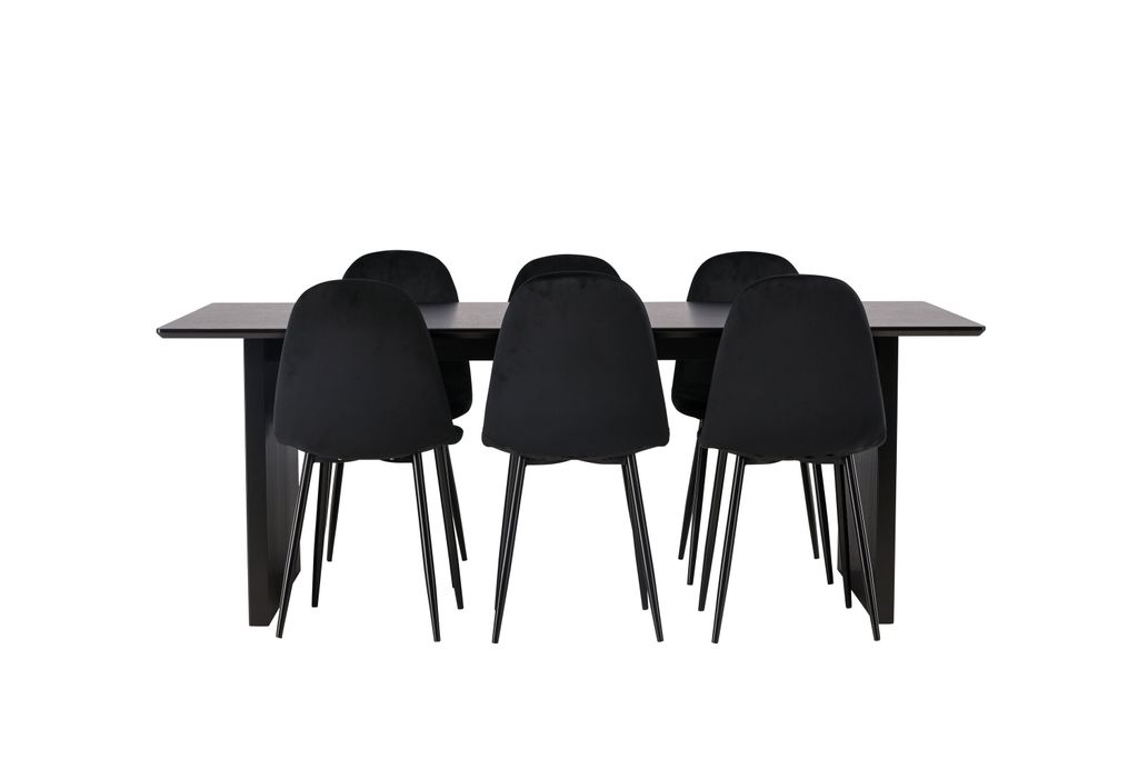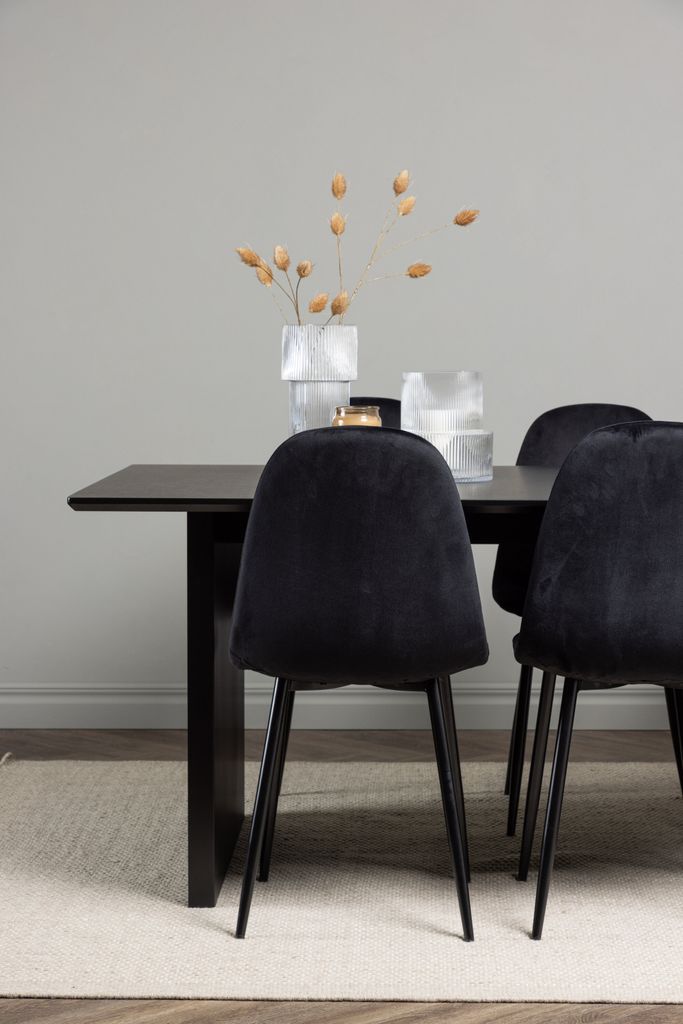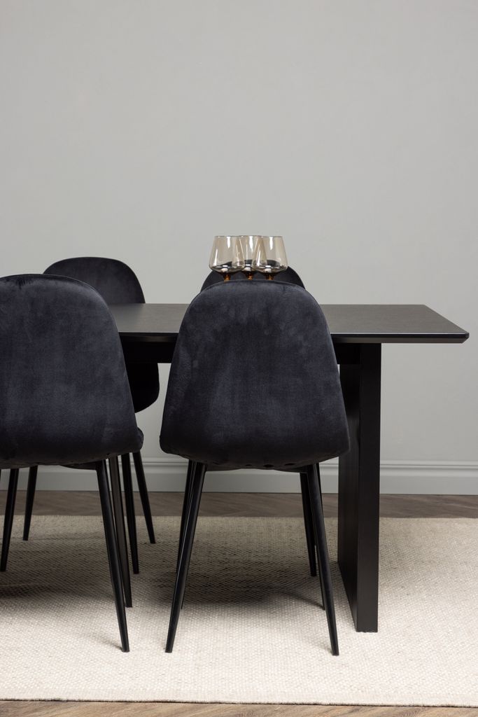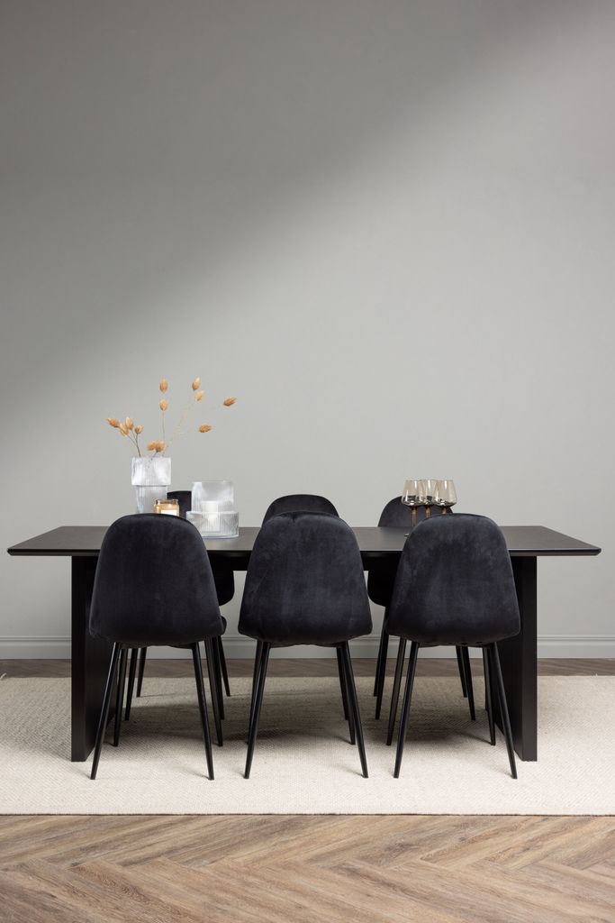 Kompletterad med de stilrena Polar-stolarna, har denna matgrupp en helklädd design med svart sammetstyg. Stolarna har en rundad rygg och sits med mjuk stoppning som erbjuder komfort under långa middagar. Benen i svart pulverlackerad metall tillför en modern touch. Dimensionsmässigt erbjuder bordet generösa mått på 200x100 cm, vilket gör det idealiskt för både vardagsmiddagar och festliga tillställningar.