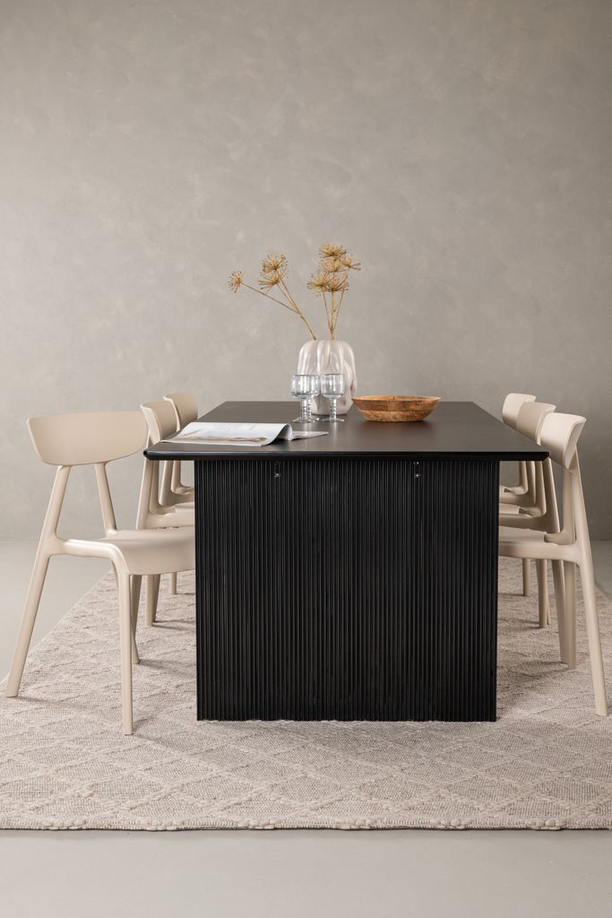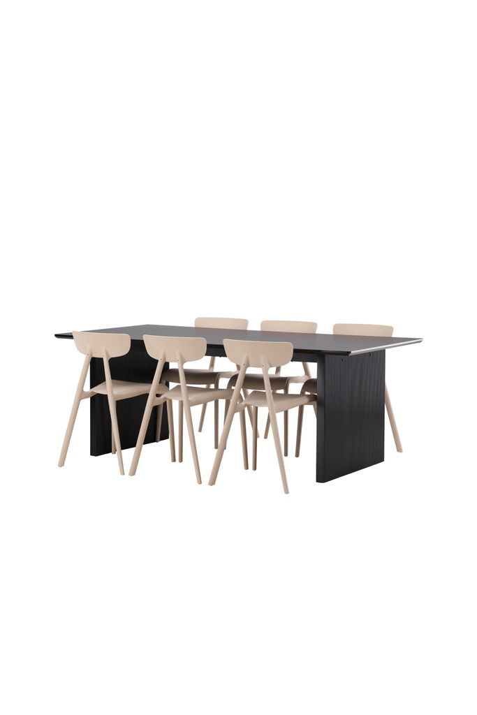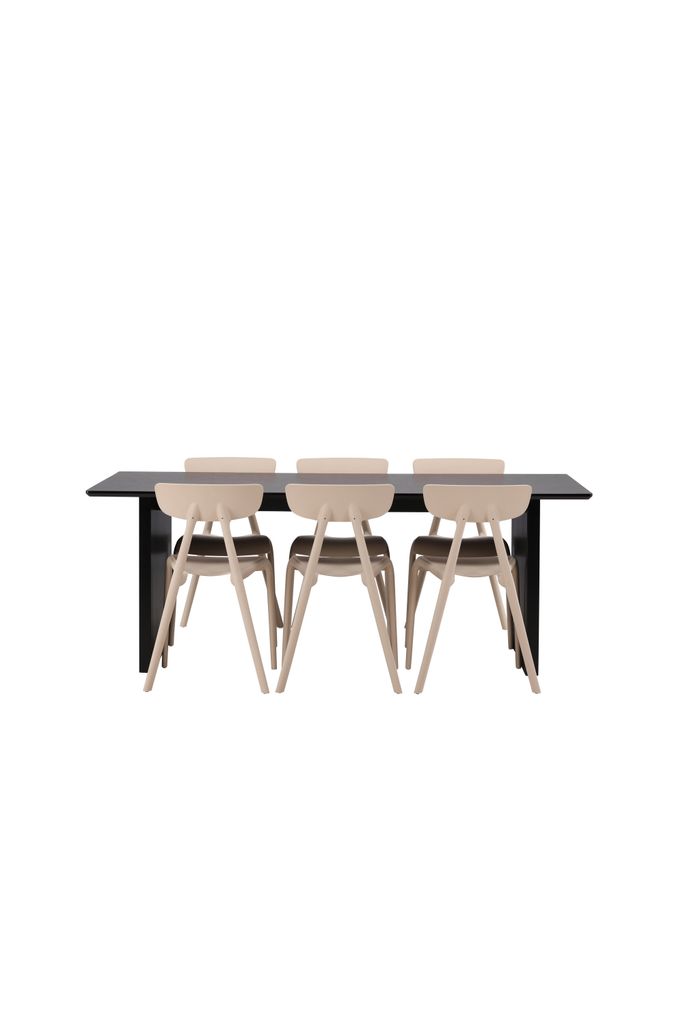Elegant matgrupp med svart bord i slitstarkt MDF och beige plaststolar. Perfekt för stilren nordisk inredning.