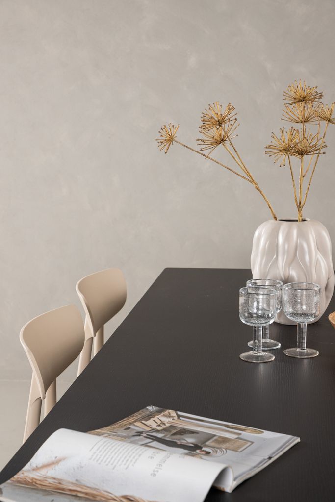 De medföljande Ursholmen stolarna är tillverkade i slitstark beige plast, vilket ger en modern kontrast till bordets mörka ton. Stolarna har en elegant design med nätt stolsrygg och något djupare sittplats, vilket kombineras med lätt utsvängda ben för ett skandinaviskt uttryck.