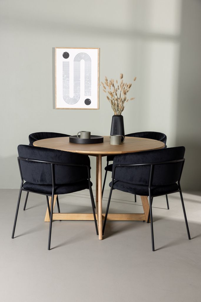 Elegant matgrupp med runt bord i ekfinish och stilfulla Selma-stolar i lyxig sammet för en tidlös inredning.