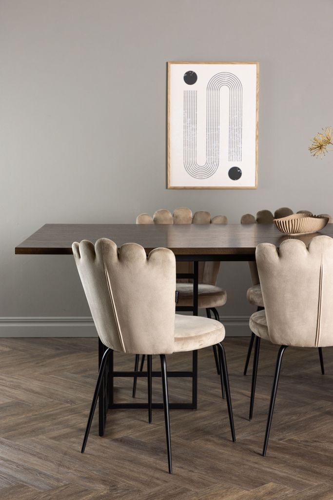 De medföljande stolarna från serien Limhamn erbjuder både skönhet och komfort. Den snäckformade ryggen med dekorativa sömmar och det eleganta beige sammetsklädseln ger en extra touch av sofistikation. Stolarnas svart pulverlackerade metallben bidrar till en stabil struktur och skapar en stilfull kontrast mot det mjuka tyget.