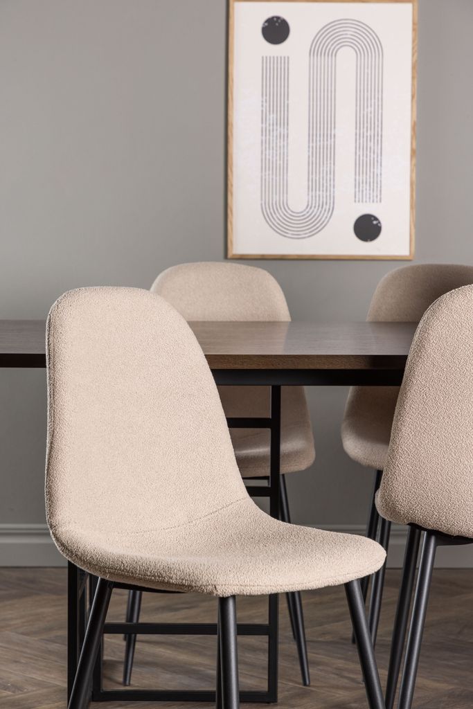 Tillsammans med de beige matstolarna från Polar-serien, blir matgruppen komplett. Dessa stolar är klädda i mjukt beige boucletyg och har ben i svart pulverlackerad metall. Den rundade ryggen och sätet ger både komfort och stil.