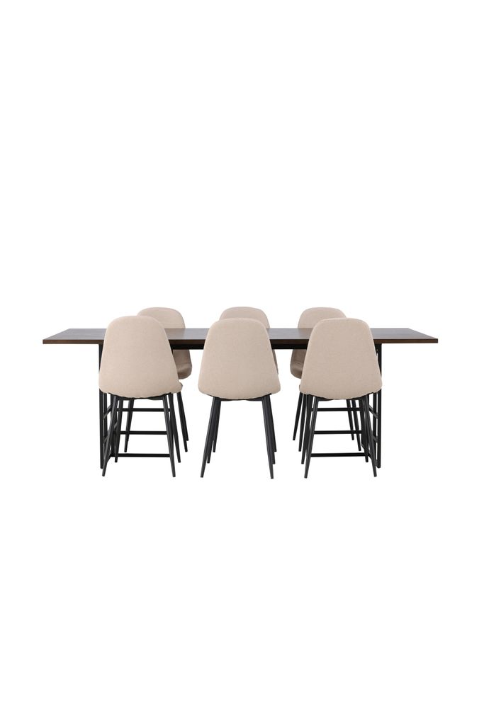 Bordet i serien Ystad har en rektangulär bordsskiva i mörkbrun MDF och ek-faner som utstrålar tidlös elegans. De två dekorativa stommarna i svart metall ger en kontrasterande industriell touch. Bordets generösa mått på 220x100 cm erbjuder gott om utrymme för dina middagsgäster.