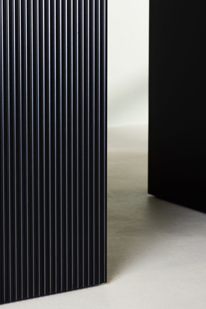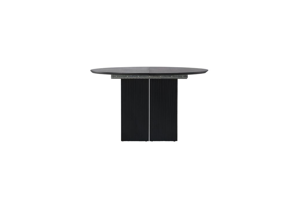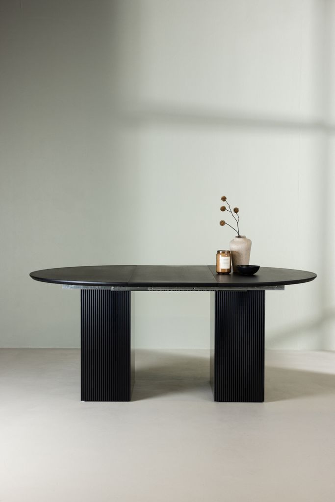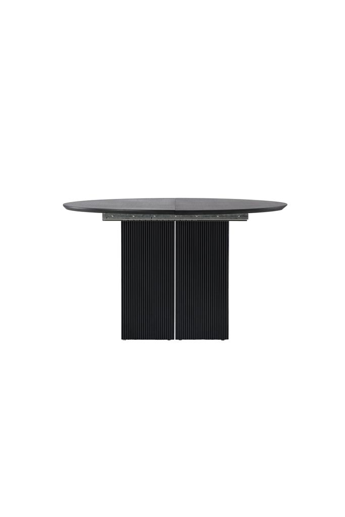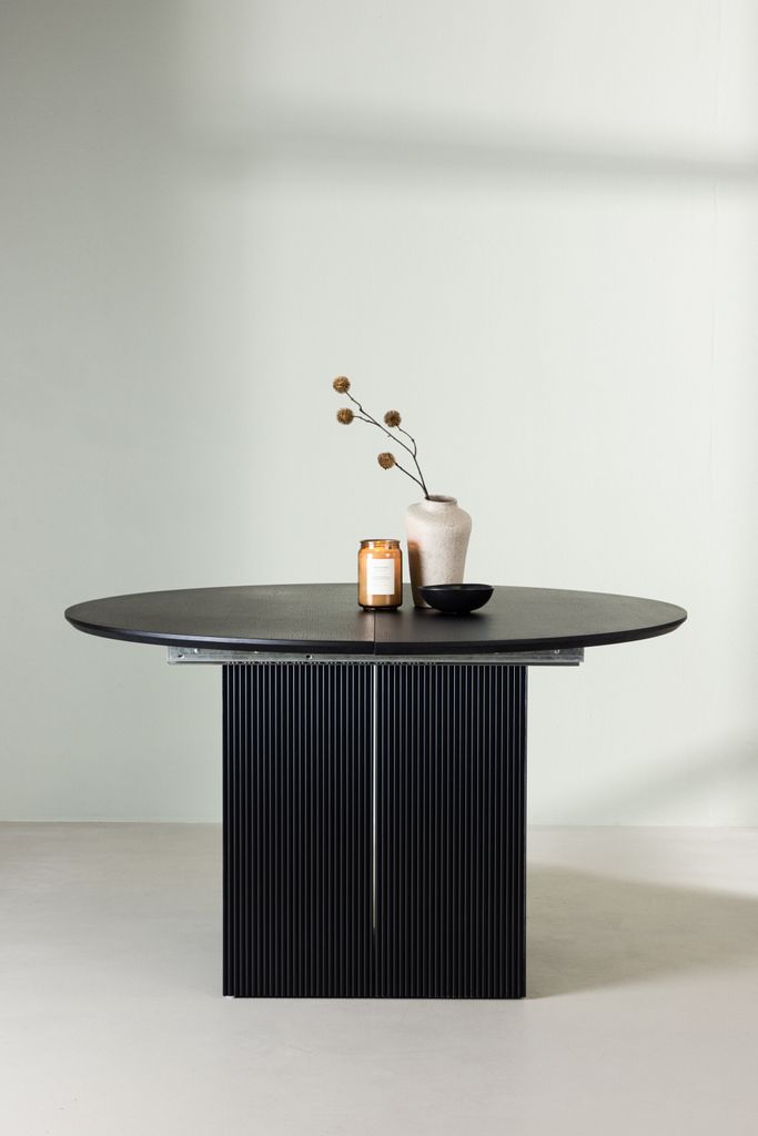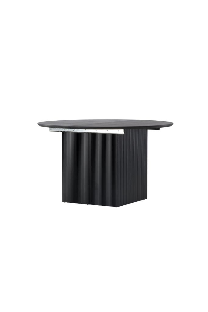Upptäck Venture Home Matilda Matbord, där funktionalitet möter stilren design. Detta runda, förlängningsbara matbord har en toppskiva i svart MDF med faner som utstrålar elegans och hållbarhet. Bordets två klossformade ben, också i svart och med en subtil ribbad textur, ger ett robust intryck och säkerställer stabilitet.