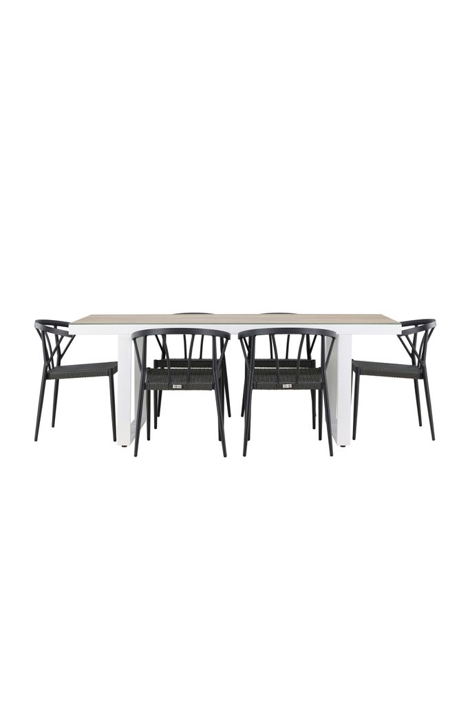 Modern elegans och tidlös enkelhet med sex Stina stolar och Merlo bord. Perfekt för stilfulla sammankomster.
