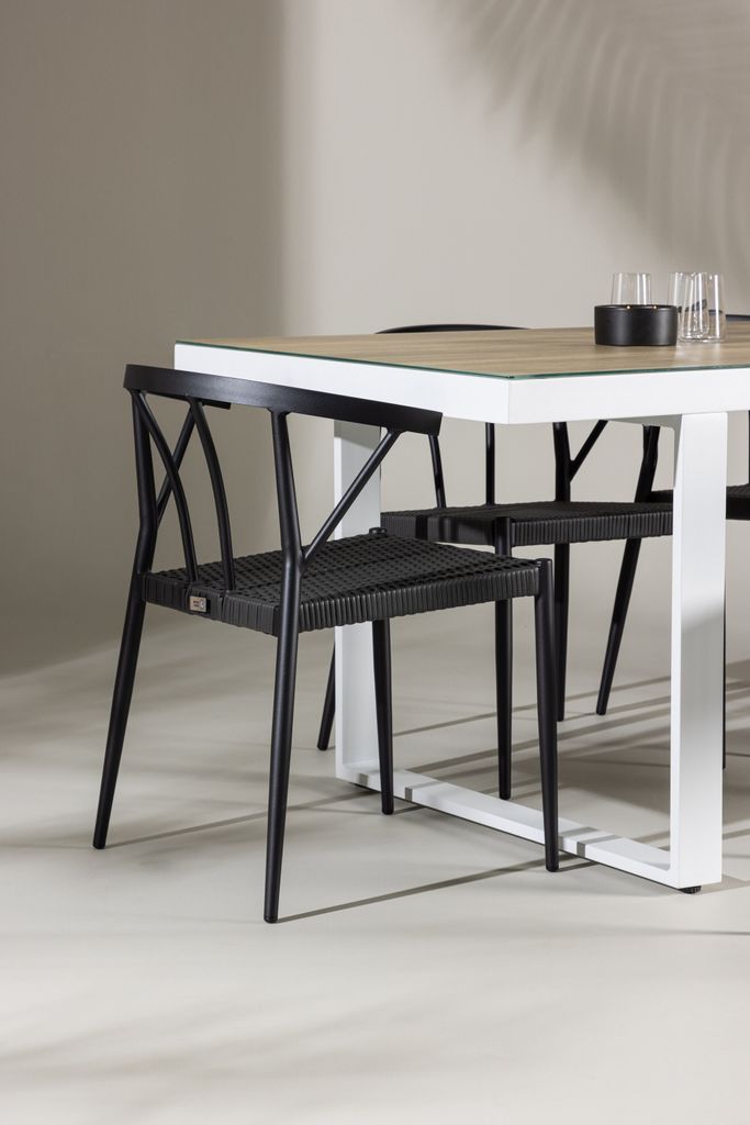- Stina stolar: De djupt svarta stolarna med flätat wicker material erbjuder exceptionell komfort och sofistikerad estetik. Aluminiumstommen ger både stabilitet och en elegant design.