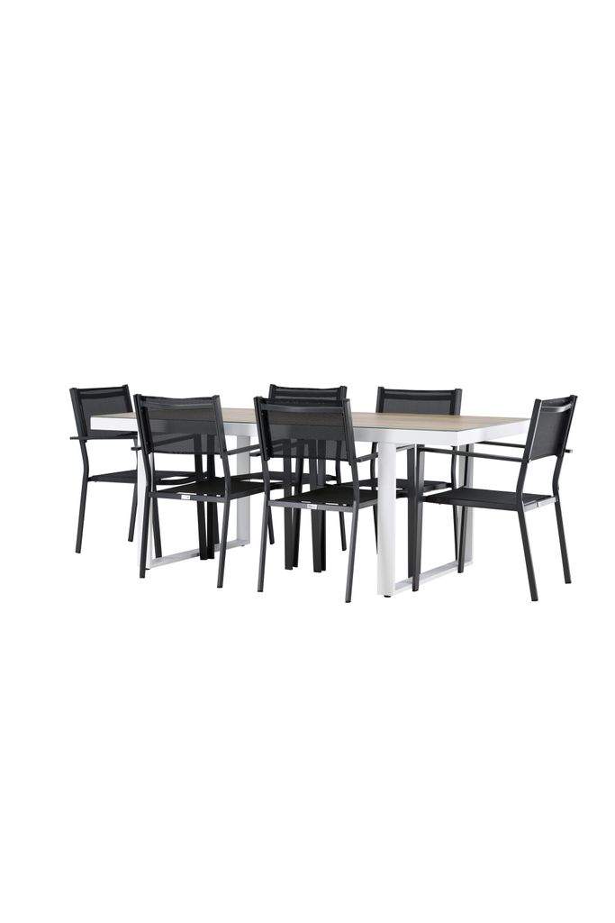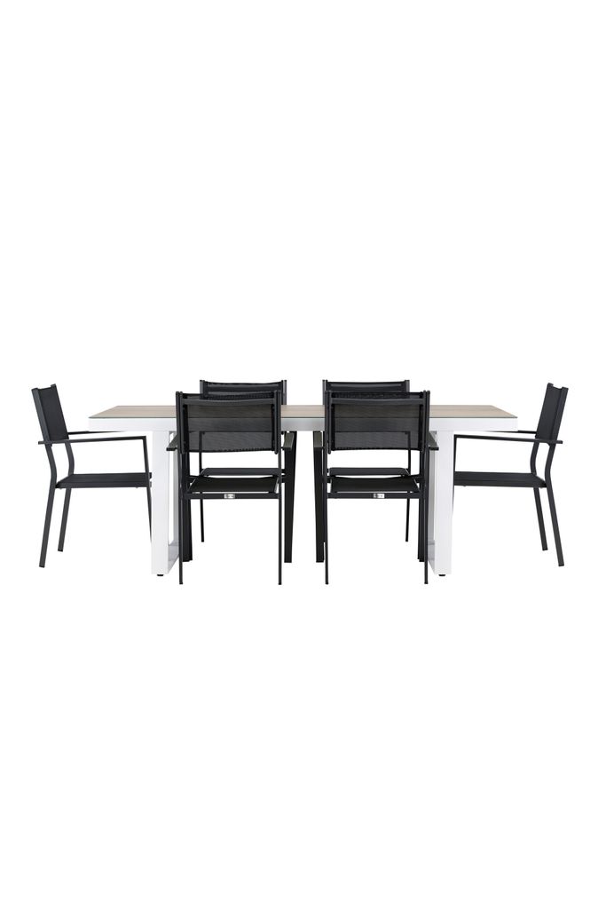 Elegant utomhusmatgrupp med ett stilrent aluminium- och glasskivebord samt sex bekväma Copacabana-stolar för sociala stunder.