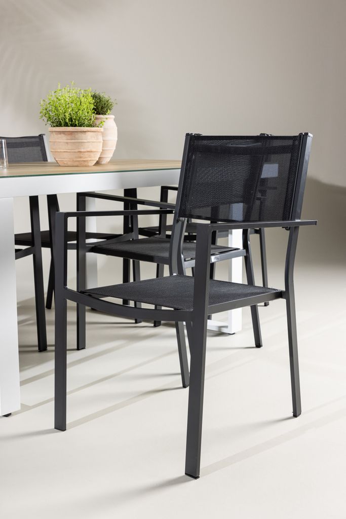 De Copacabana-stolarna är designade med en djup svart färg och tillverkade av hållbart aluminium, vilket ger både komfort och stil. Stolarna är lätta att flytta, vilket gör det enkelt att anpassa sittningen efter behov.