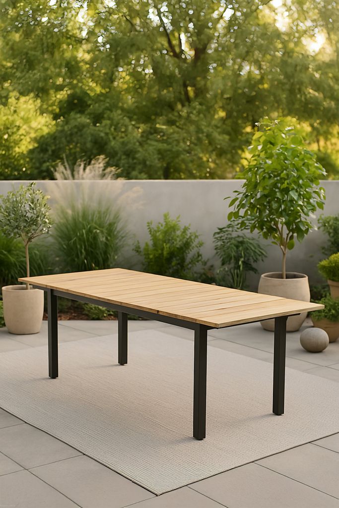 Stilrent och förlängningsbart matbord i teak och svart metall, perfekt för både vardag och fest.