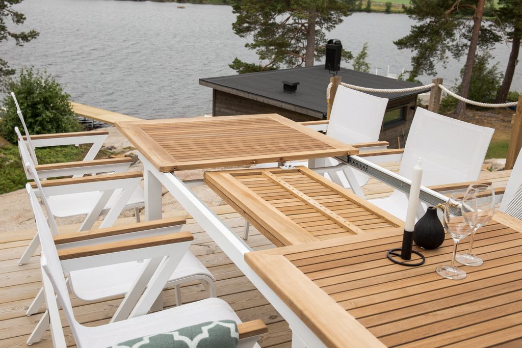 Stolarna är tillverkade av aluminium och Textilene, ett slitstarkt och vattenresistent material som är UV-behandlat för att motverka solblekning. Den vita färgen tillsammans med de naturliga teakdetaljerna ger ett fräscht och tidlöst utseende.