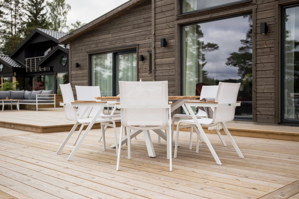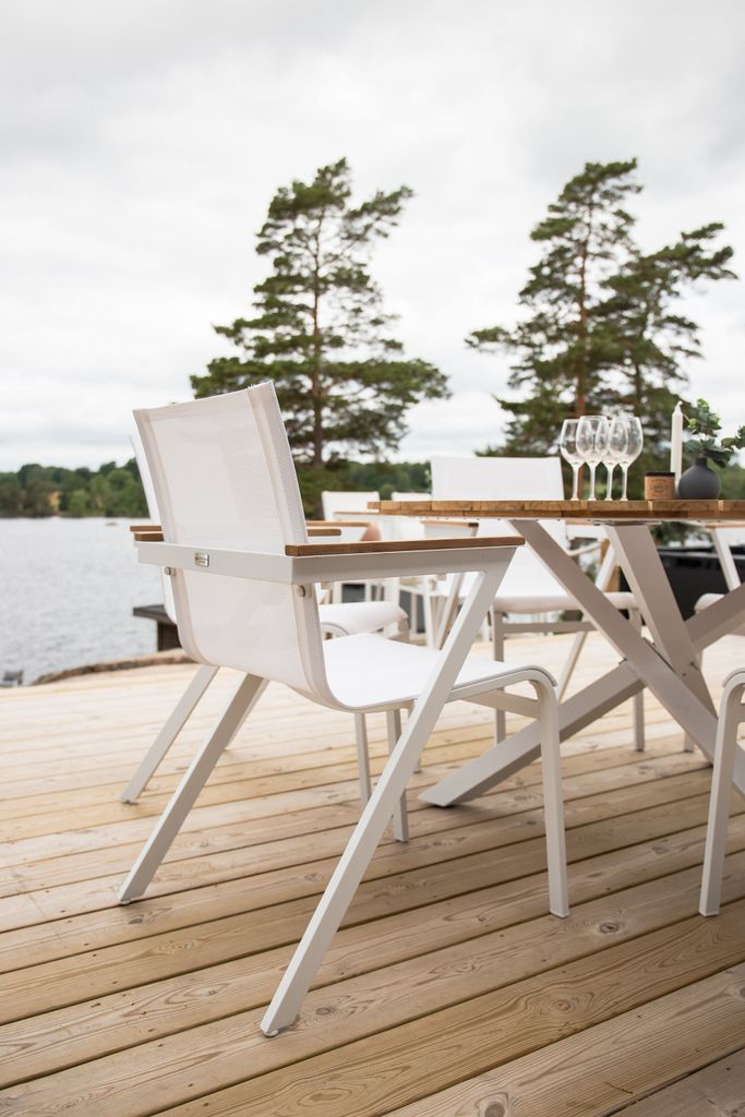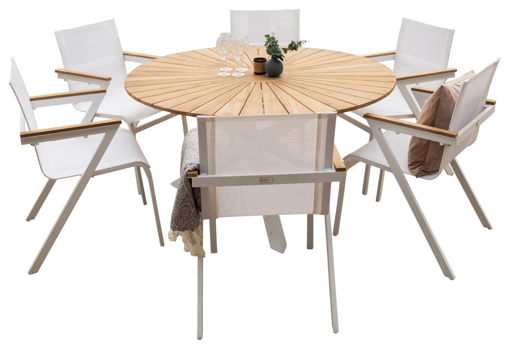 De medföljande stolarna har en smakfull design med en sittdel i vit textilene och lätt utsvängda ben i aluminium, vilket bidrar till både stabilitet och stil. De dekorativa armstöden i teak kompletterar helheten och ger en harmonisk känsla.