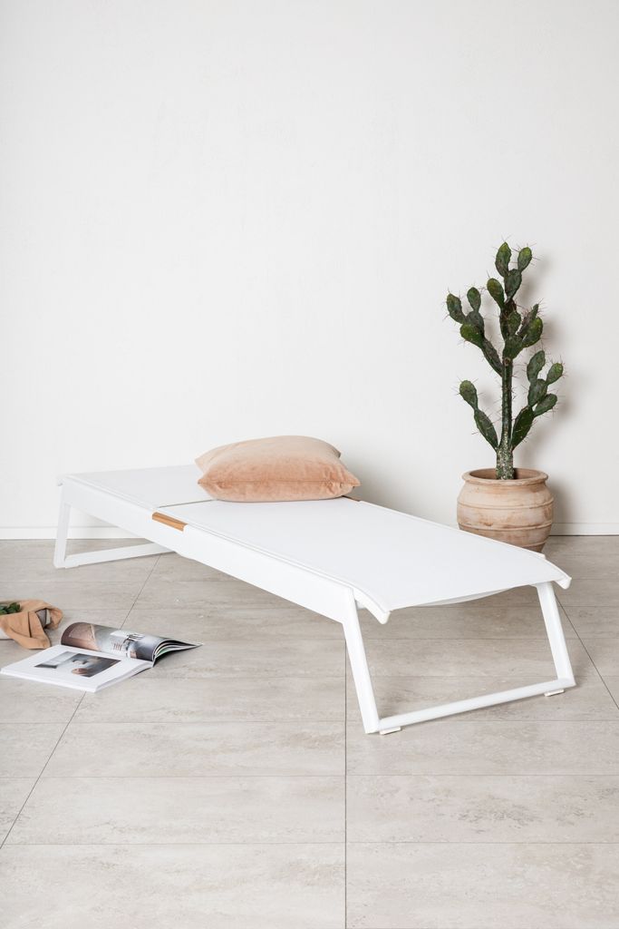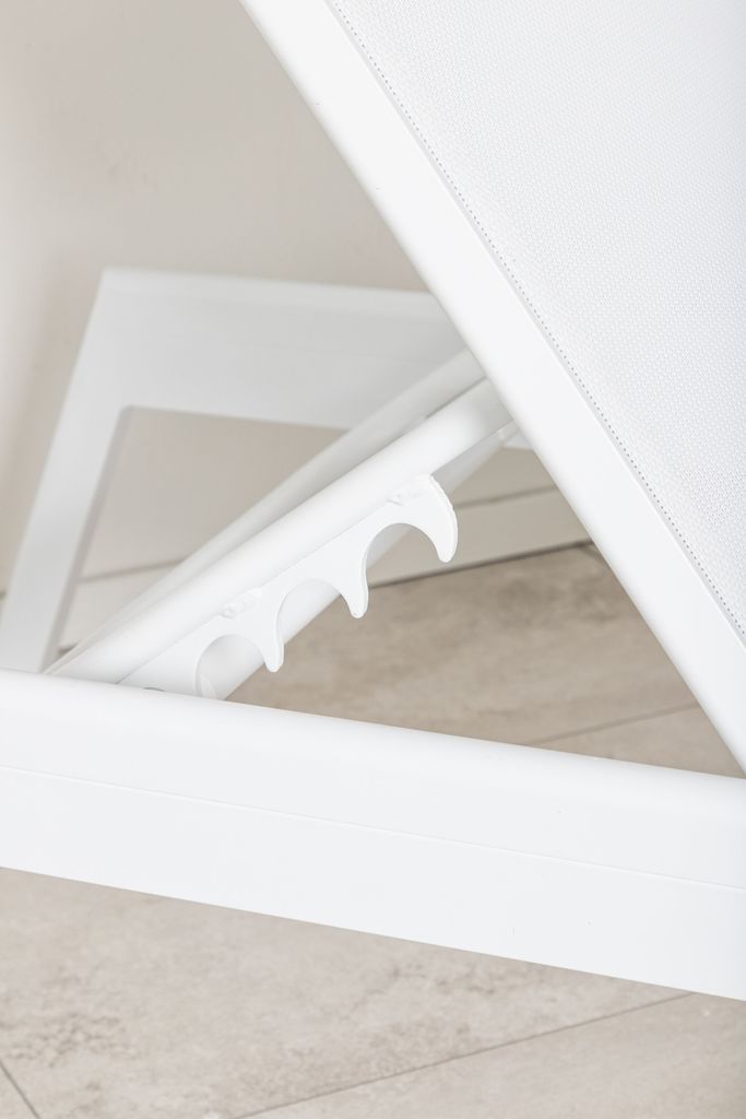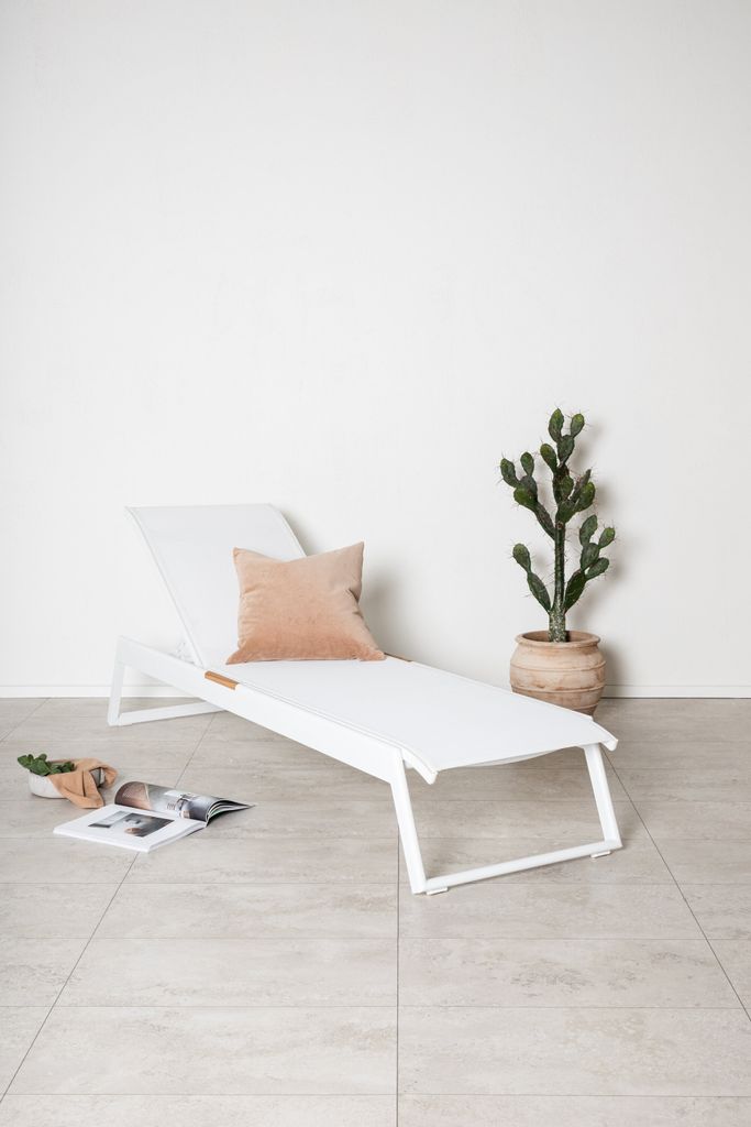 Stilren vit solstol i aluminium och teak med justerbart ryggstöd för optimal komfort utomhus.