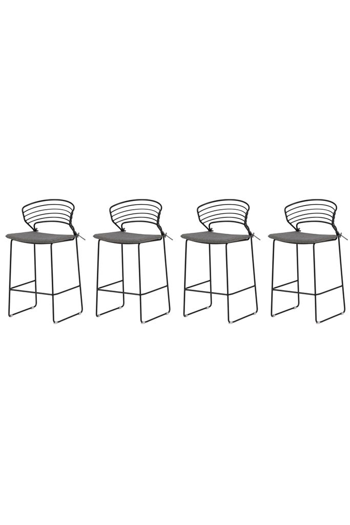 Stilren, stapelbar barstol med mjukt stoppad sits i grått tyg och svart stålram, perfekt för uteplatsen.