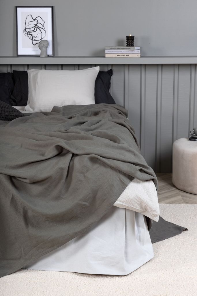 Milo överkast i grått linne, följsamt och slitstarkt. Mått 250x180 cm, skapar en stilren och inbjudande känsla.