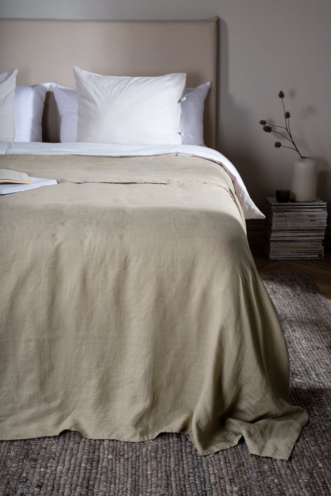 Lyxigt och charmigt överkast i beige linne, 260x260 cm. Perfekt för en städat och stilren säng.