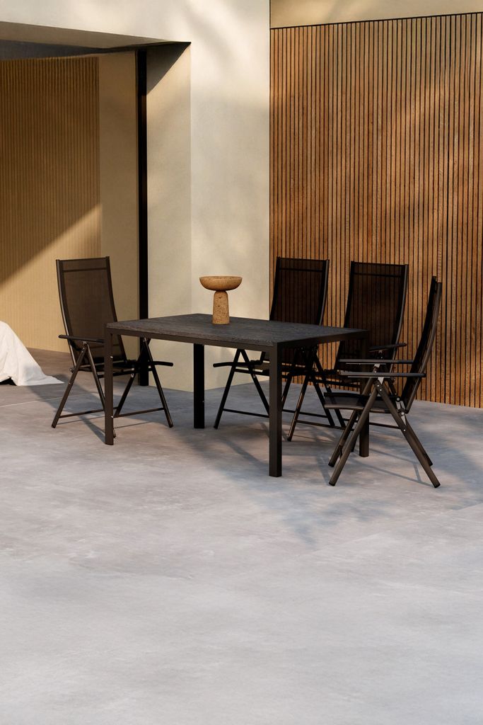 Snygg och funktionell matgrupp för utomhusbruk med svart aluminium, plywood och textilene.