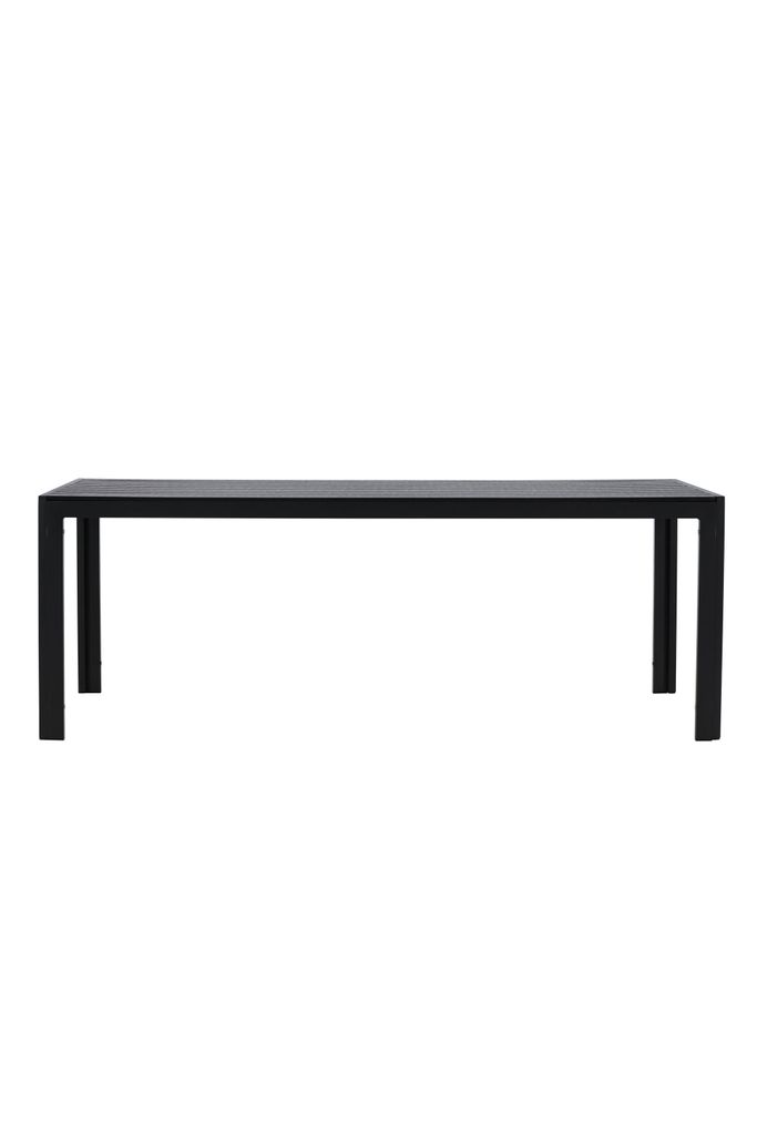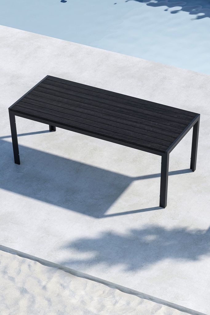 Bordets eleganta svarta färg ger ett sofistikerat utseende, medan dess aluminiumram säkerställer lättviktighet och rostbeständighet. Den vackra bordsskivan i polywood tillför en naturlig värme och elegans, perfekt för både vardagsbruk och sociala sammankomster.