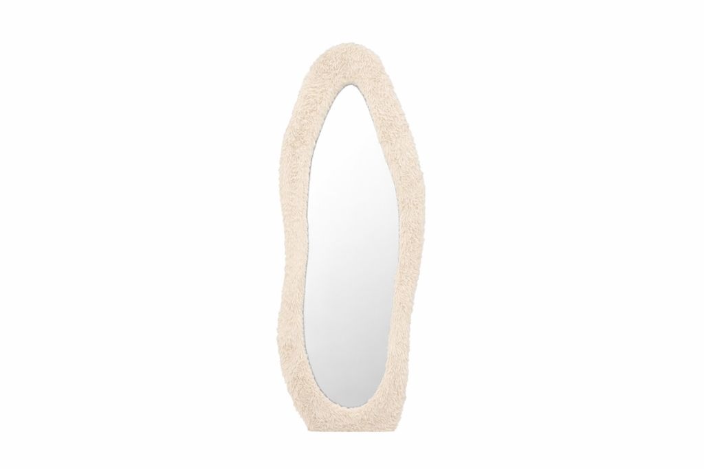 Mirza är en spegel som verkligen sticker ut. Den mjuka ramen i beige fuskpäls ger ett lekfullt och modernt uttryck som tillför värme och karaktär till rummet.