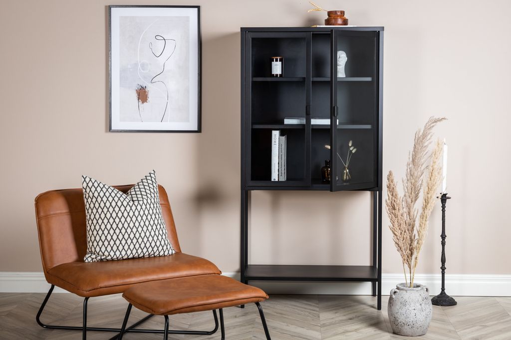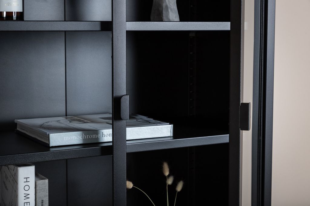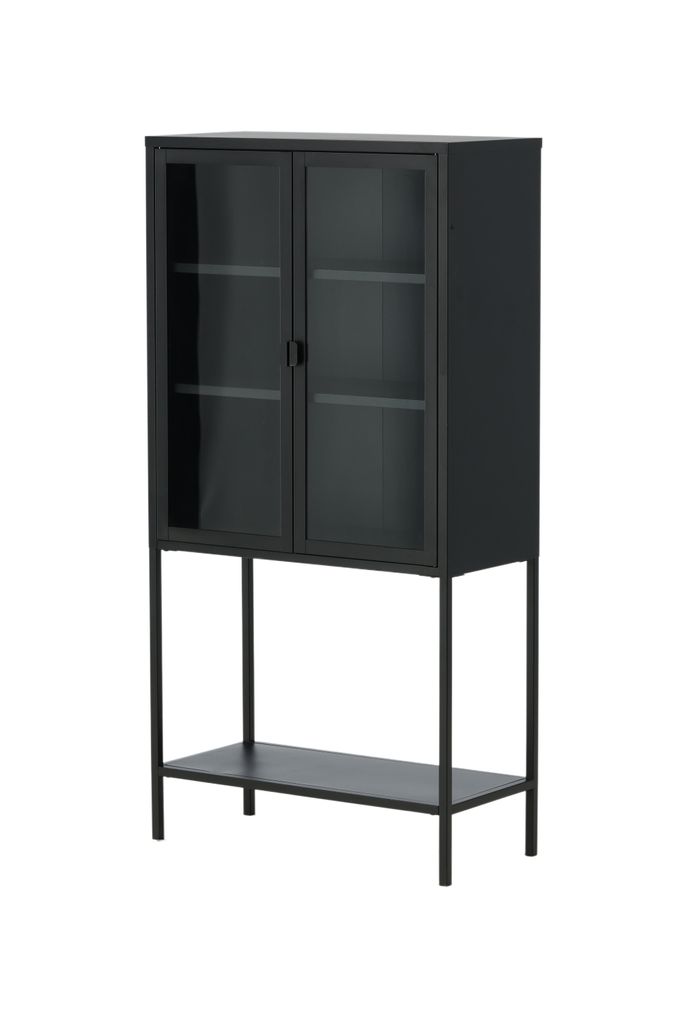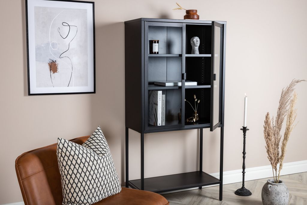 Venture Home Misha Förvaringsmöbel är en elegant och praktisk lösning för ditt hem. Tillverkad i pulverlackerad svart stål med två glasdörrar som släpper in ljus och accentuerar innehållet. Misha har en modern nordisk design med raka linjer och tre hyllplan som erbjuder flexibel förvaring för porslin, böcker eller dekorativa föremål.
