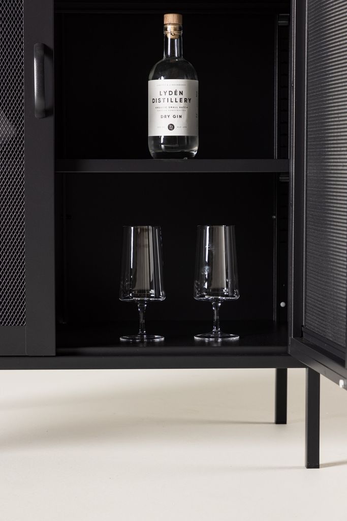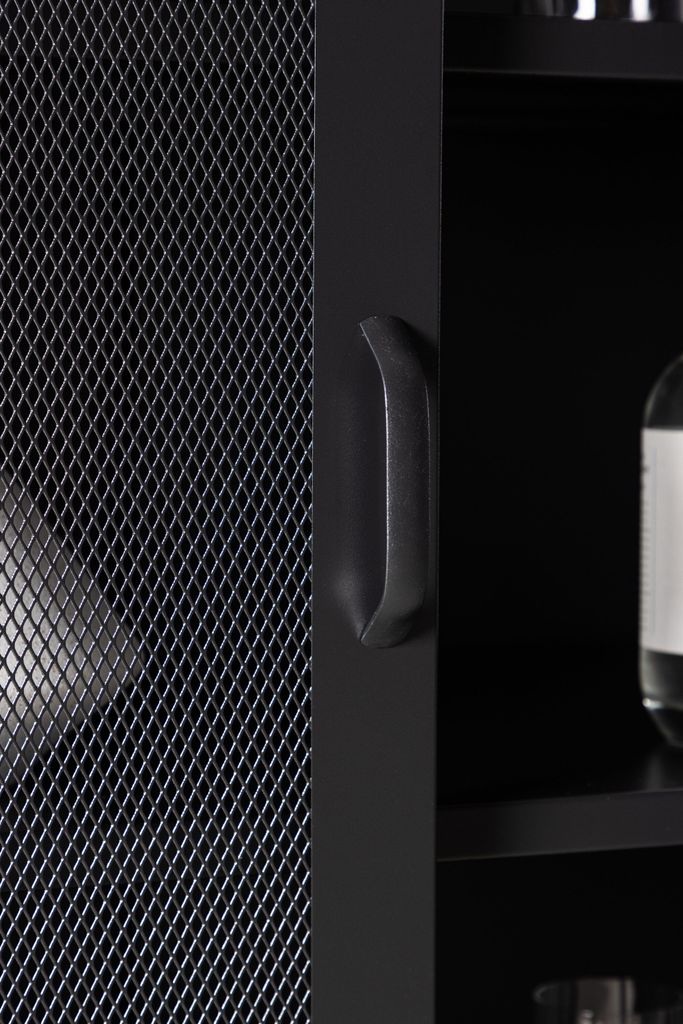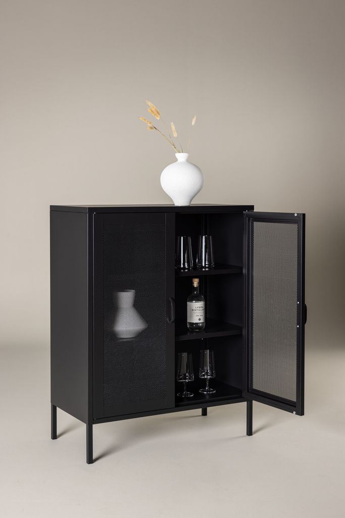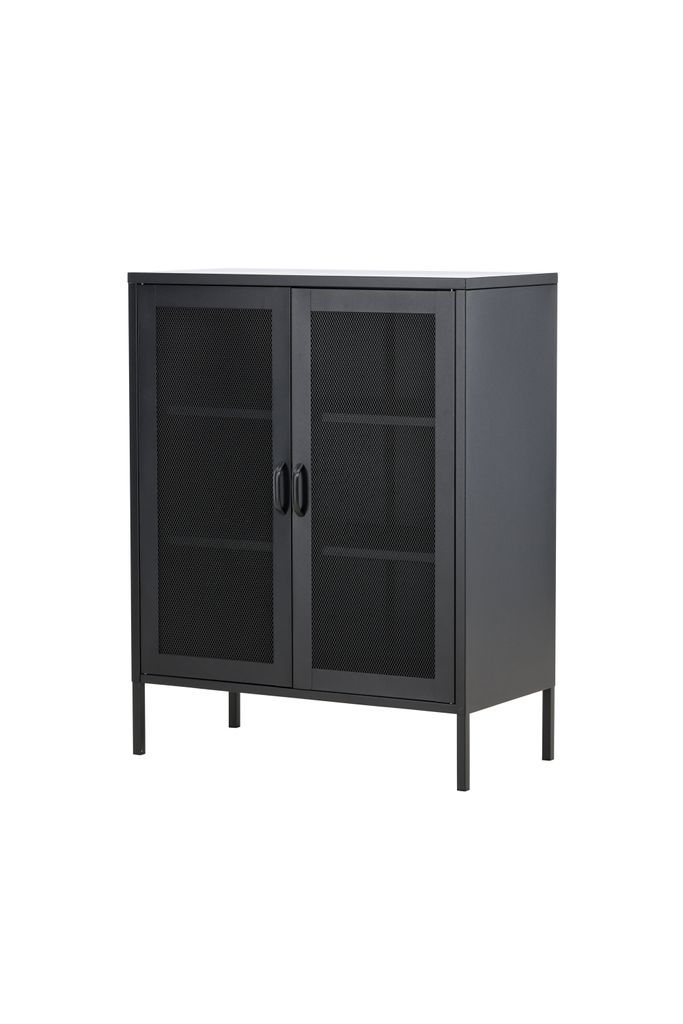 Venture Home Misha Förvaringsskåp är det perfekta tillskottet för ditt moderna hem. Med en tuff industriell design, tillverkad av svart pulverlackerad stål, erbjuder detta skåp både stil och funktion. De eleganta nätdörrarna ger en unik visuell appeal samtidigt som de håller dina tillhörigheter skyddade.
