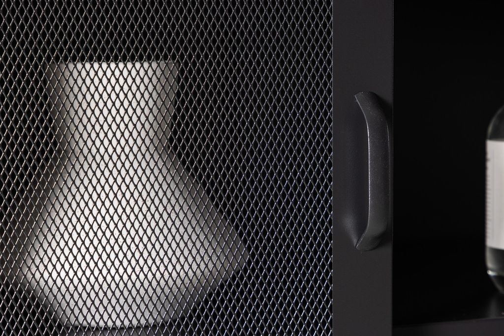 Det som särskiljer Misha är dörrarna: tillverkade i finmaskigt perforerat stål som både döljer och visar. Det transparenta nätmönstret skapar ett subtilt spel mellan ljus och skuggor, och låter konturerna av innehållet anas utan att exponeras helt. En smart lösning som kombinerar estetik med praktisk ventilation.