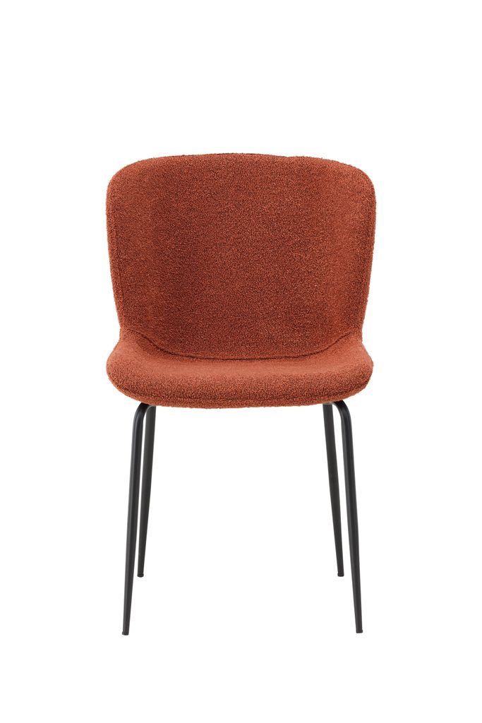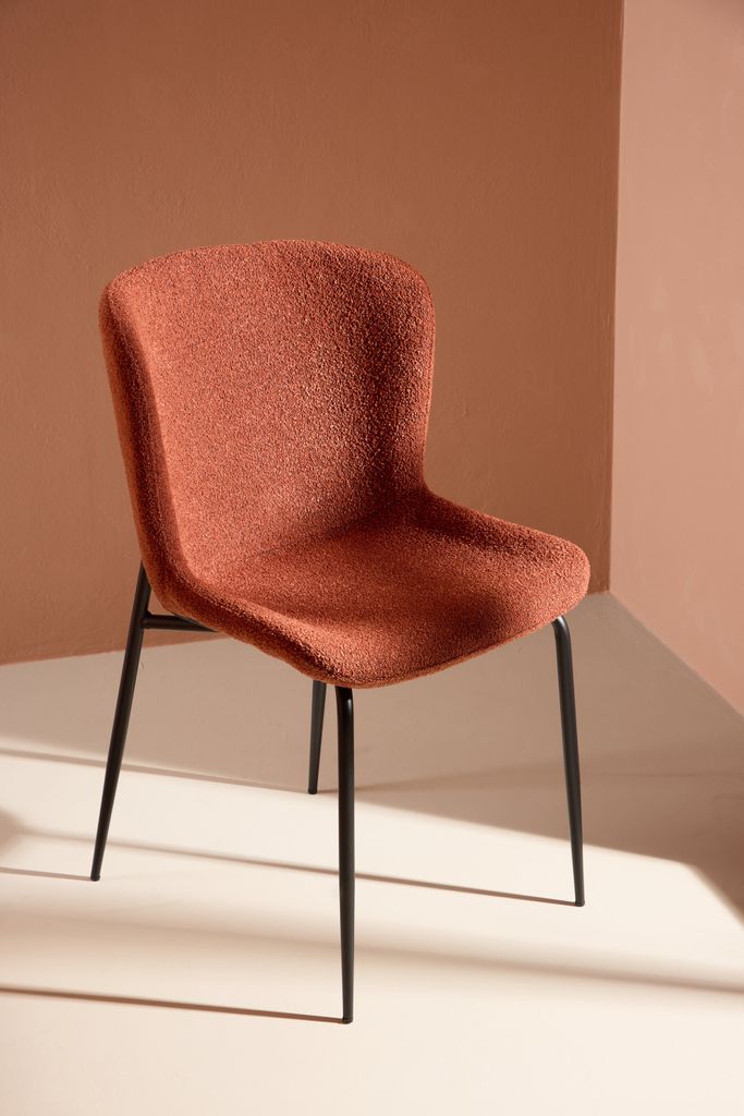 Stilfull och bekväm matstol med rostfärgad boucle och svarta ben, perfekt för moderna hem.
