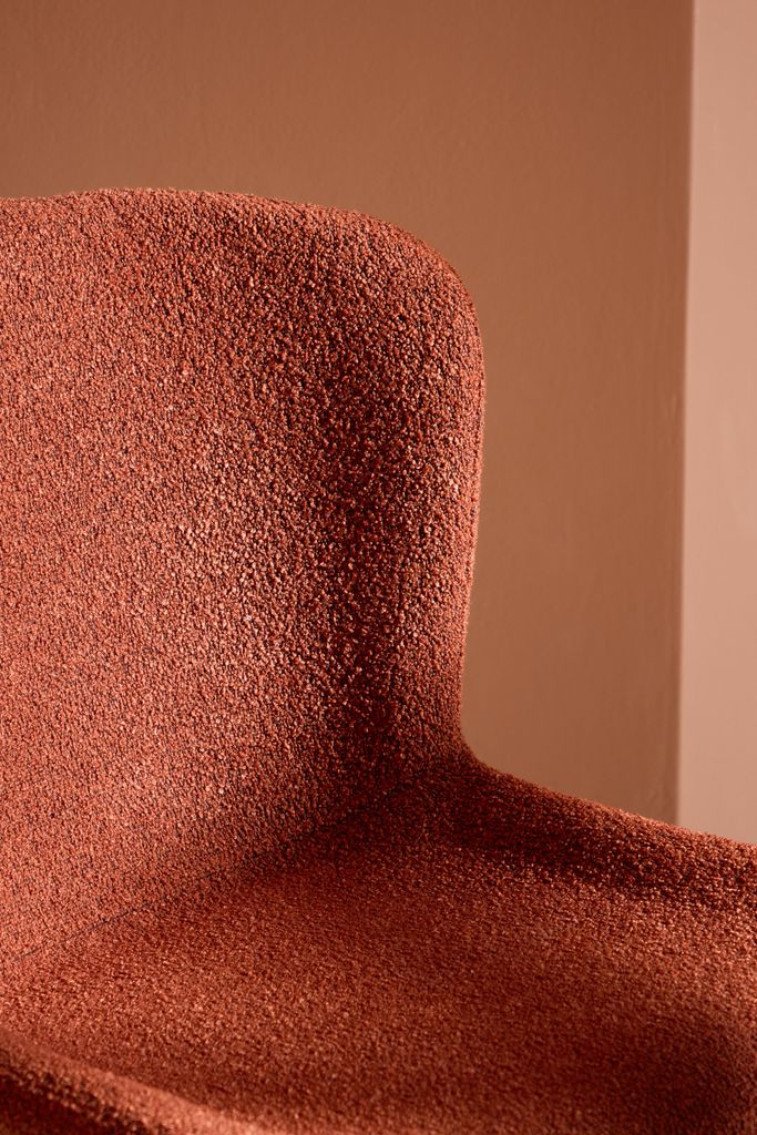 Stolens robusta, svarta ben ger en stabil och säker grund, medan boucléns rika textur erbjuder en mjuk och bekväm sittupplevelse. Den rostfärgade sitsen står i vacker kontrast till de släta, svarta benen, vilket ger en sofistikerad och inbjudande känsla. Den ergonomiska designen säkerställer optimal komfort, vilket gör Modesto till det perfekta valet för långa middagar och trevliga samtal.