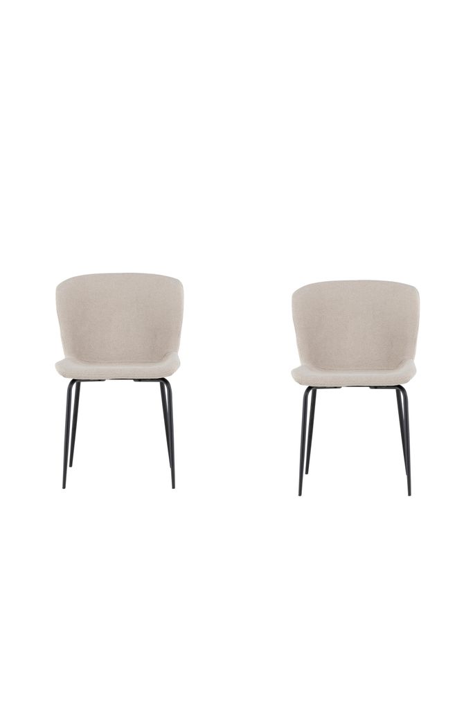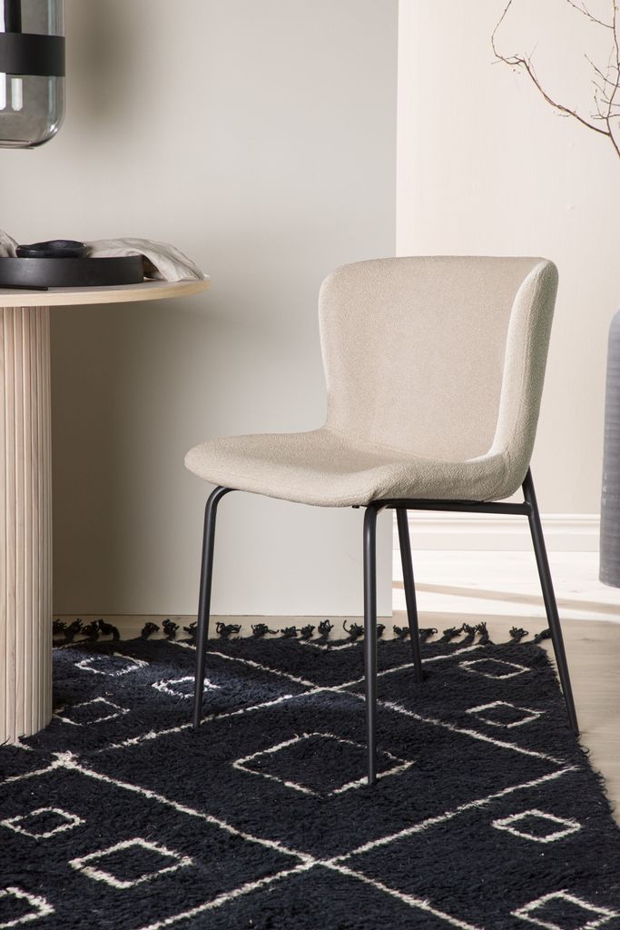 Modesto matstol i beige bouclé och svart metall, kombinerar stil och komfort för trivsam matplats.